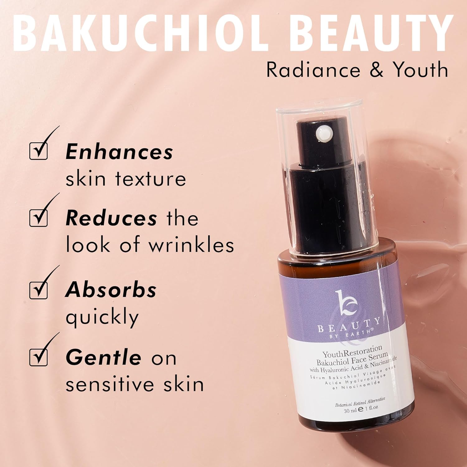 WHAT IS BAKUCHIOL It's a vegan ingredient from the Psoralea corylifolia plant. It's a potent antioxidant, visibly reduces skin discoloration from environmental exposure, has a soothing effect & can reduce the appearance of fine lines & wrinklesPLANT BASED RETINOL ALTERNATIVE SKIN BRIGHTENING SERUM: No photosensitivity that comes with pure retinol for face or retinoid serum for face. Bakuchiol oil has the same anti aging facial serum benefits on the skin as when using retinoids for faceDARK SPOT CORRECTOR FOR FACE: We have this anti aging face serum packed with potent ingredients, such as hyaluronic acid, niacinamide and aloe vera. Niacinamide and bakuchiol work wonders as a dark spot remover for face and to prevent new onesFACIAL SERUMS FOR WOMEN: Even teens can use this bakuchiol retinol alternative serum. Powerful skin serum anti aging & firming face serum. Use as skin glow serum, day serum, night serum or resurfacing retinol serum alternative facial serums