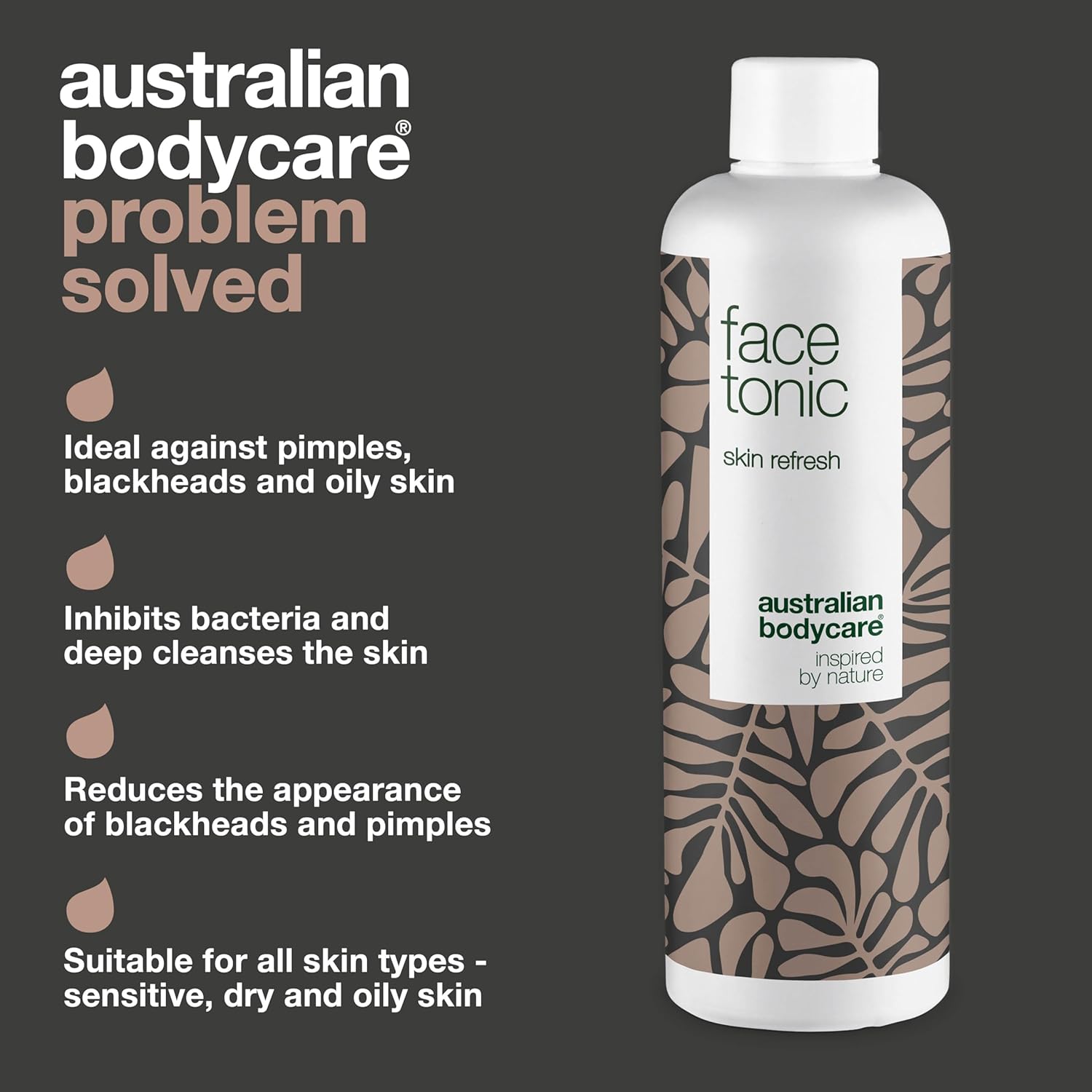 About this item ?? RESULTS: What can I expect and when Most men and women will begin to see results after 1-2 weeks, especially if they use the tea tree toner daily in combination with face cream and face wash from Australian Bodycare. Itās important that you don't expect results overnight, it will take some time. If you havenāt seen any signs of improvement after 2 weeks, send us a mail and receive a FULL REFUND! ?? HOW TO USE: How often should I use the product Use once or twice a day, after washing with face wash. Finish by using Australian Bodycare face cream. This is a leave-on product so there is no need to wash or wipe it offer after use. The tonic can be applied as a splash, with a diffuser or on a cotton pad. ?? PRODUCT INFO: The face tonic restore the skinās natural moisture balance and helps reduce skin problems by deep cleansing. It contains extract of Kakadu Plum which has a high level of antioxidant properties, and is alcohol free to ensure the skinās pH balance is maintained. Dermatologically tested by experts. ?? SUITABILITY: We have been developing problem-solving skin care products of superior quality for more than 30 years. We develop all our products using top?shelf ingredients. With regards to quality, we do not compromise. Our product is 100% vegan and contains natural active ingredients. ?? 100% SATISFACTION: Australian Bodycare provides a full refund within 180 days including shipping. No questions asked, and no returns necessary. If you are not completely satisfied with the product, we will refund your purchase. DELIVERY: Is the packaging discreet Yes, the product will be delivered in a plain brown box. āŗ See more product details,?? RESULTS: What can I expect and when Most men and women will begin to see results after 1-2 weeks, especially if they use the tea tree toner daily in combination with face cream and face wash from Australian Bodycare. Itās important that you don't expect results overnight, it will take some time. If you havenāt seen any signs of improvement after 2 weeks, send us a mail and receive a FULL REFUND!,?? HOW TO USE: How often should I use the product Use once or twice a day, after washing with face wash. Finish by using Australian Bodycare face cream. This is a leave-on product so there is no need to wash or wipe it offer after use. The tonic can be applied as a splash, with a diffuser or on a cotton pad,?? PRODUCT INFO: The face tonic restore the skinās natural moisture balance and helps reduce skin problems by deep cleansing. It contains extract of Kakadu Plum which has a high level of antioxidant properties, and is alcohol free to ensure the skinās pH balance is maintained. Dermatologically tested by experts,?? SUITABILITY: We have been developing problem-solving skin care products of superior quality for more than 30 years. We develop all our products using top?shelf ingredients. With regards to quality, we do not compromise. Our product is 100% vegan and contains natural active ingredients,?? 100% SATISFACTION: Australian Bodycare provides a full refund within 180 days including shipping. No questions asked, and no returns necessary. If you are not completely satisfied with the product, we will refund your purchase. DELIVERY: Is the packaging discreet Yes, the product will be delivered in a plain brown box