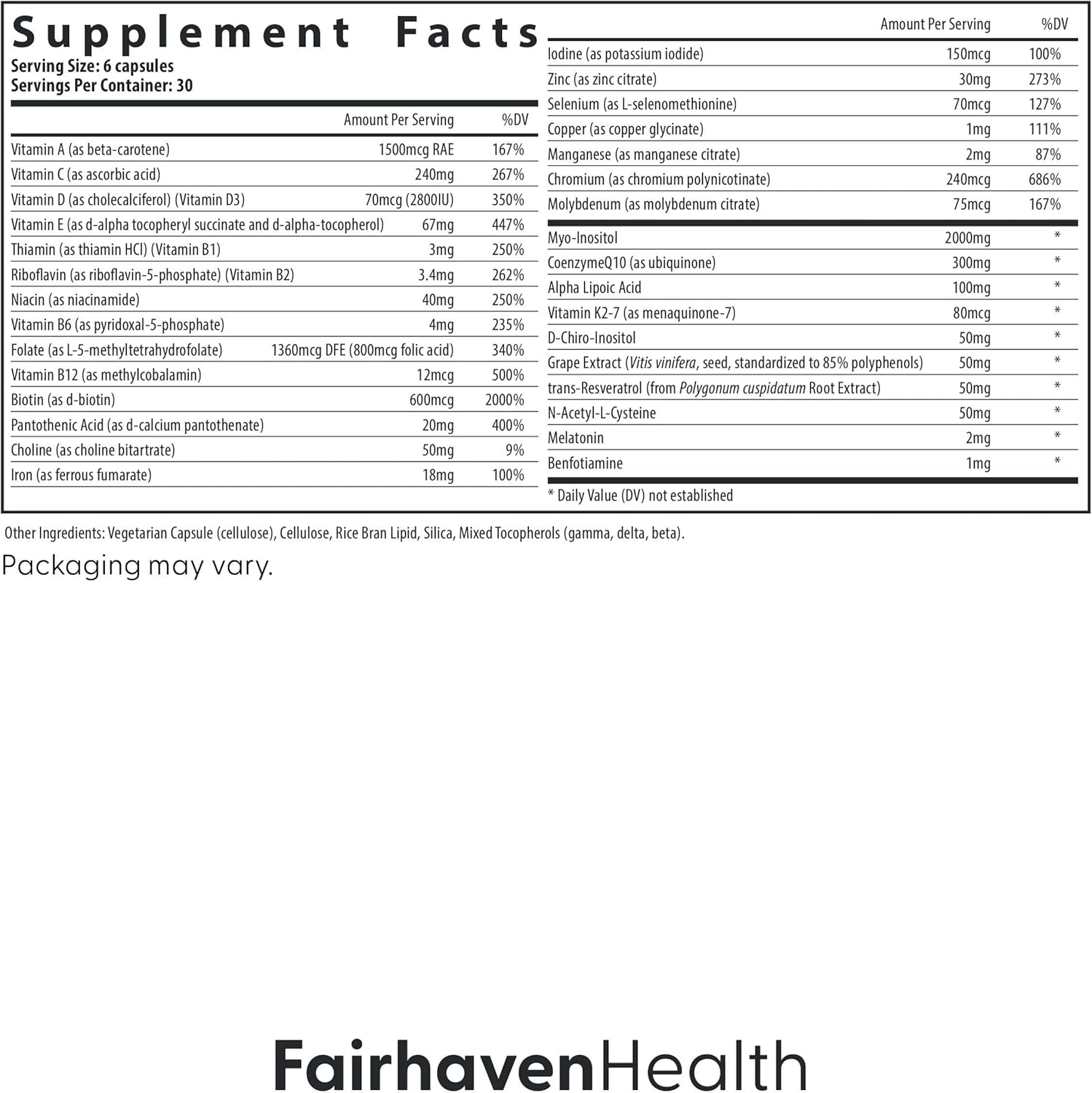 Scientifically Studied Comprehensive Female Fertility Formula. This patented formula offers a 3-in-1 approach to women’s reproductive health by combining a comprehensive preconception multivitamin, specialty nutrients for female fertility including myo- and D-chiro inositol, and added antioxidants to support egg health including CoQ10, melatonin, beta-carotene, resveratrol, and NAC
