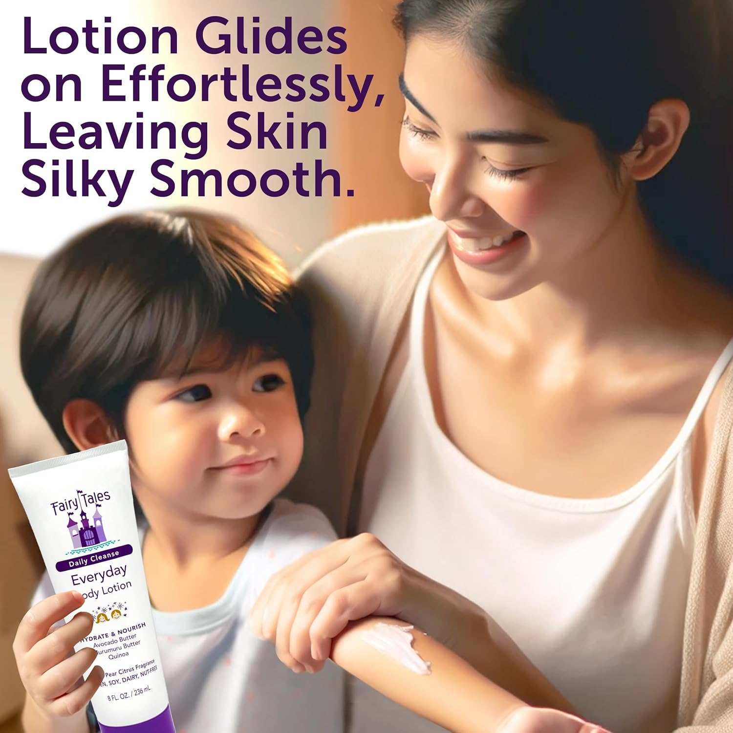 About this item Kids Body Lotion: This rich and creamy lotion glides on and is quickly absorbed into the skin. Moisturizes leaving the skin feeling smooth and soft, without leaving a greasy residue Non Toxic Kids Lotion: Kids moisturizing body lotion for dry skin by harnessing the power of aloe, avocado butter, murumuru butter, and quinoa to replenish moisture and leave skin hydrated and silky soft Pair Together with Daily Cleanse Products: Complete the entire kids routine with the other Daily Cleanse products that include shampoo, conditioner, body wash and kids conditioning spray No Yucky stuff only Clean: Paraben free, phthalate free, gluten free, soy free, dairy free and nut-free. No harsh chemicals or toxins. Touched off with a natural pear citrus fragrance. Fairy Tales Hair Care: We have been naturally caring for families since 1999. Our growing lines of products consist of Rosemary Repel, Tangle Tamer, Curly Q, Daily Cleanse, and the Sun and Swim line See more product details,Kids Body Lotion: This rich and creamy lotion glides on and is quickly absorbed into the skin. Moisturizes leaving the skin feeling smooth and soft, without leaving a greasy residue,Non Toxic Kids Lotion: Kids moisturizing body lotion for dry skin by harnessing the power of aloe, avocado butter, murumuru butter, and quinoa to replenish moisture and leave skin hydrated and silky soft,Pair Together with Daily Cleanse Products: Complete the entire kids routine with the other Daily Cleanse products that include shampoo, conditioner, body wash and kids conditioning spray,No Yucky stuff only Clean: Paraben free, phthalate free, gluten free, soy free, dairy free and nut-free. No harsh chemicals or toxins. Touched off with a natural pear citrus fragrance,Fairy Tales Hair Care: We have been naturally caring for families since 1999. Our growing lines of products consist of Rosemary Repel, Tangle Tamer, Curly Q, Daily Cleanse, and the Sun and Swim line
