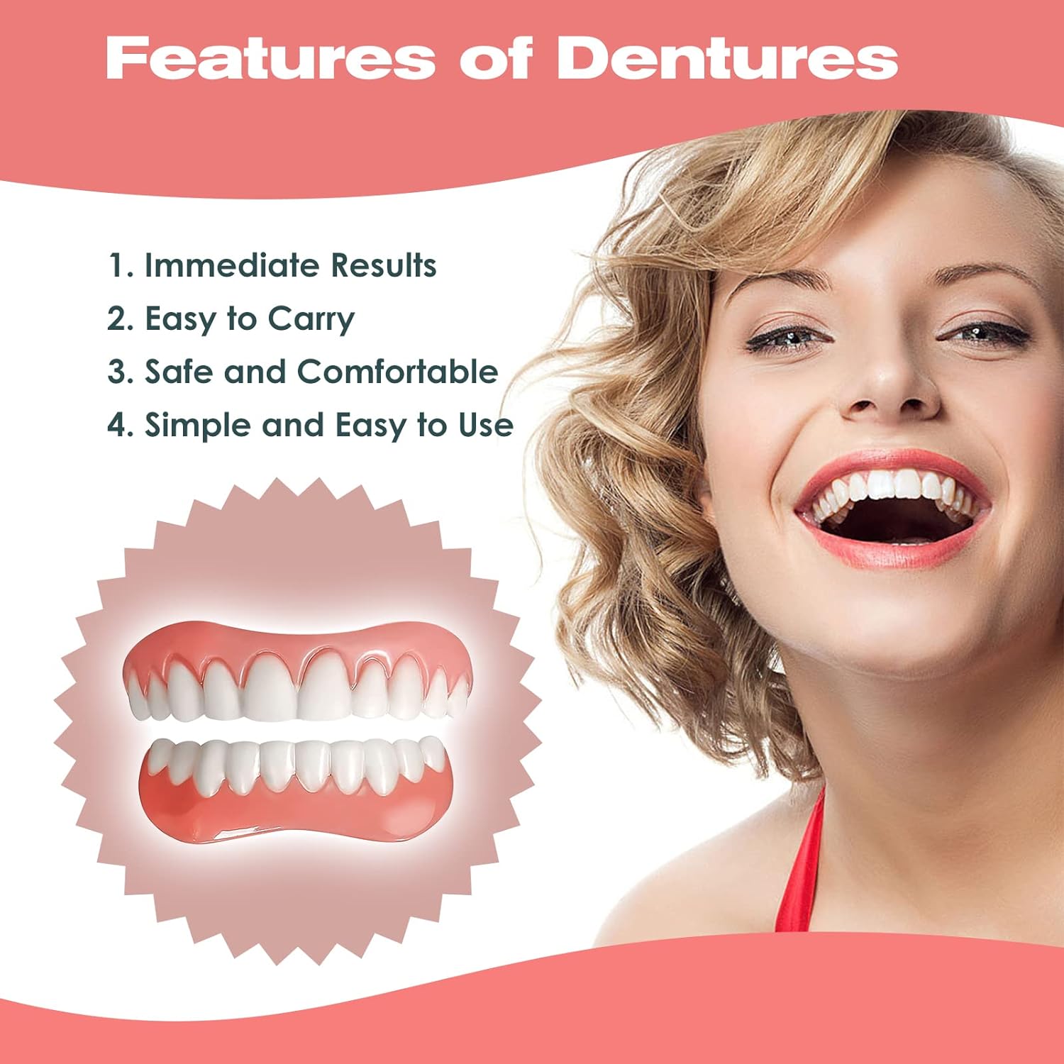 ABOUT THE PRODUCT: 1 > Comfortable to WearThe perfect imprint on the inner surface of the teeth is what keeps the teeth all day, not the glue. So comfortable that your curious tongue doesn't know it exists 2 > Nature & ComfortableDesigned with ultra-thin flex technology, it looks like a set of perfect teeth and gums. Comfortable and no foreign body sensation 3 > Adjustable SizeAdjustable to fit most people after putting in hot water (boil) before use. You can reheat and reshape as many times as you like until you are satisfiedEasy use