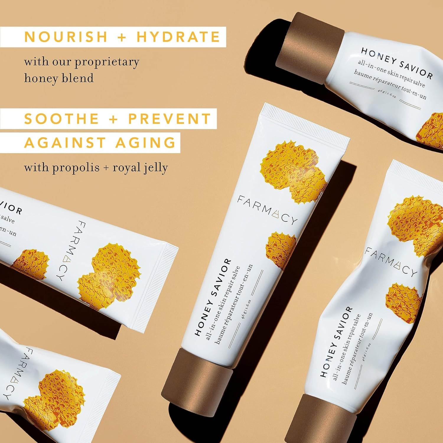 The Farmacy Way: Our goal is simple. We want to bring out the best version of your radiant self with the best possible, naturally derived ingredients. Each women's skincare and beauty product we craft uses cutting-edge science to harness the healing powers of ingredients that Mother Nature has been so kind as to provide for usRevitalize The Right Way: Loaded with 132 nutrients, including amino acids, antioxidants and vitamins A, B, C & royal jelly; this healing salve truly is a savoir. Nourish, protect, and support skin renewal for a healthy glowNaturally Soothing: Used since ancient times for wound care, honey naturally retains moisture and remains one of the best ways to relieve dry skinMultipurpose: This versatile salve can save the day in so many different ways! Use as a hand lotion to soften skin. Rescue parched lips as a lip balm. Or use it as a face gloss on cheekbones for a spotlight effectHow To Use: Apply a small amount to clean skin and massage until fully absorbed. Use as needed throughout the body for targeted careFarmacy Honey Savior All-In-One Skin Repair Salve - Hydrating & Nourishing Balm - 46g