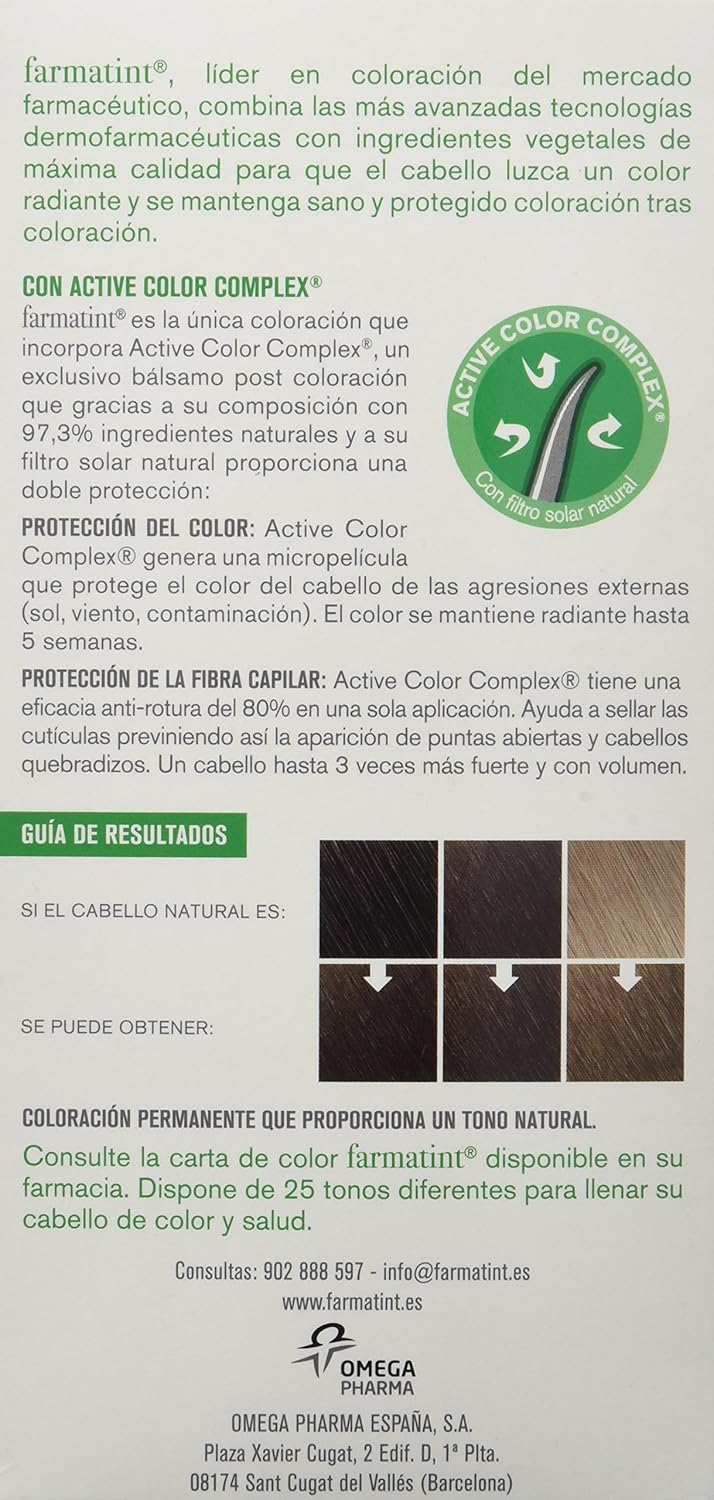 Farmatint covers 100% of grey hair, bringing vitality to hair and providing a healthy look, an intense, bright and durable colour. Farmatint contains no heavy metals. It is recommended that an allergy test be taken, particularly for people who already suffer from allergies. Farmatint does not contain iodine. It is recommended that an allergy test be taken as laid out on the package. Farmatint dyes do not contain Sodium Lauryl Sulfate. Farmatint does not contain benzene as a raw material or in any of our materials,100% coverage; does not contain ammonia, parabens, resorcinol or,Unique coloration that contains active complex, an exclusive post colouring Balm which, thanks to its natural composition with 97.3% natural ingredients and solar filter provide double protection,Advanced technology dermofarmacéutica with vegetable ingredients of the highest quality,Read the instructions before using the product
