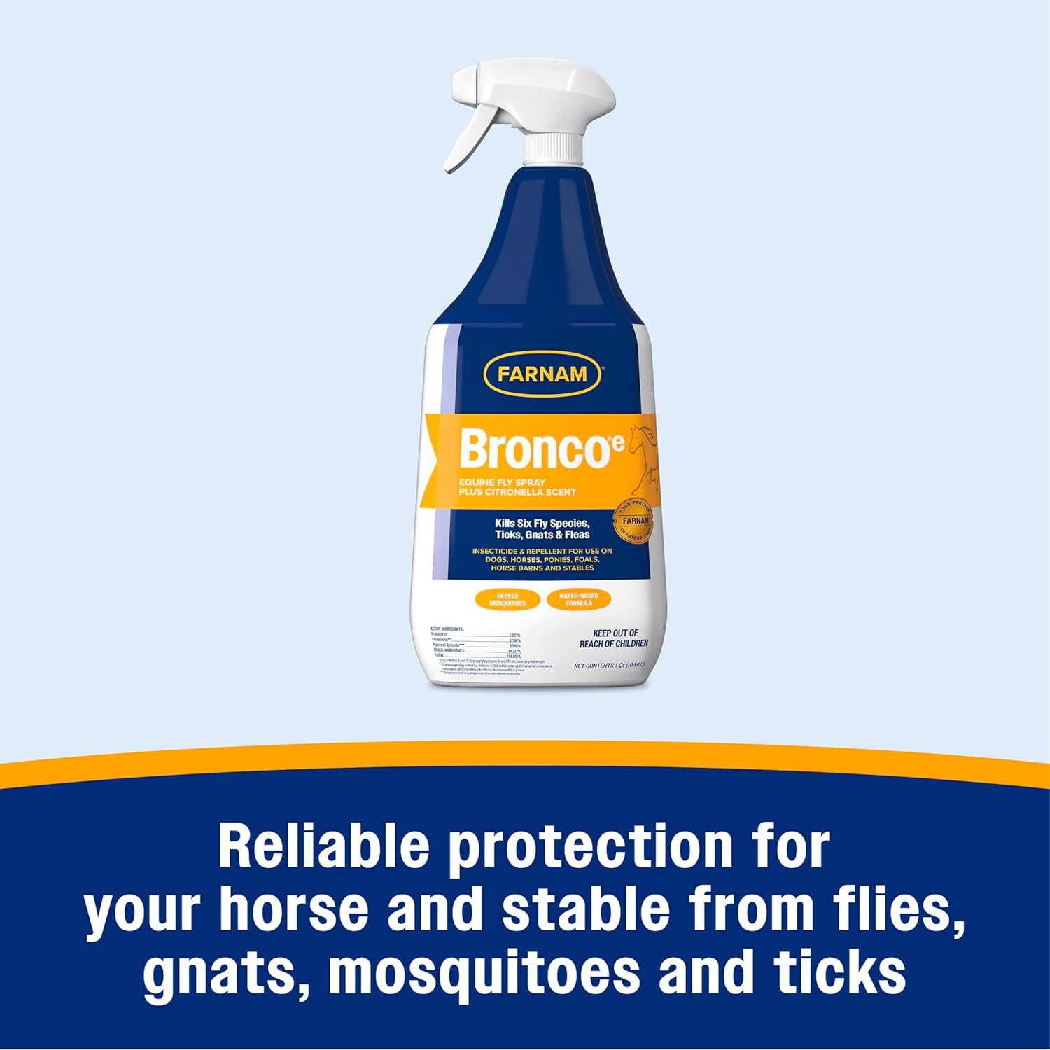 About this item DEFEND AGAINST DISEASE with an effective spray that kills six fly species, gnats, ticks, deer ticks, fleas, chiggers and lice, and repels mosquitoes. MULTI-PURPOSE INSECTICIDE AND REPELLENT that can protect your horses, dogs and premises all in one convenient bottle. NON-OILY, WATER-BASED SPRAY WITH CITRONELLA SCENT that offers protection without leaving behind greasy residue. DECREASE THE FLY POPULATION IN AND AROUND YOUR BARN by applying Bronco e Equine Fly Spray Plus Citronella Scent in doorways, on surfaces or as a mist in the air. CONVENIENT TO USE & AVAILABLE in 32 oz. Ready-To-Use Spray and 128 oz. Gallon Refill. See more product details,DEFEND AGAINST DISEASE with an effective spray that kills six fly species, gnats, ticks, deer ticks, fleas, chiggers and lice, and repels mosquitoes,MULTI-PURPOSE INSECTICIDE AND REPELLENT that can protect your horses, dogs and premises all in one convenient bottle,NON-OILY, WATER-BASED SPRAY WITH CITRONELLA SCENT that offers protection without leaving behind greasy residue,DECREASE THE FLY POPULATION IN AND AROUND YOUR BARN by applying Bronco e Equine Fly Spray Plus Citronella Scent in doorways, on surfaces or as a mist in the air,CONVENIENT TO USE & AVAILABLE in 32 oz. Ready-To-Use Spray and 128 oz. Gallon Refill