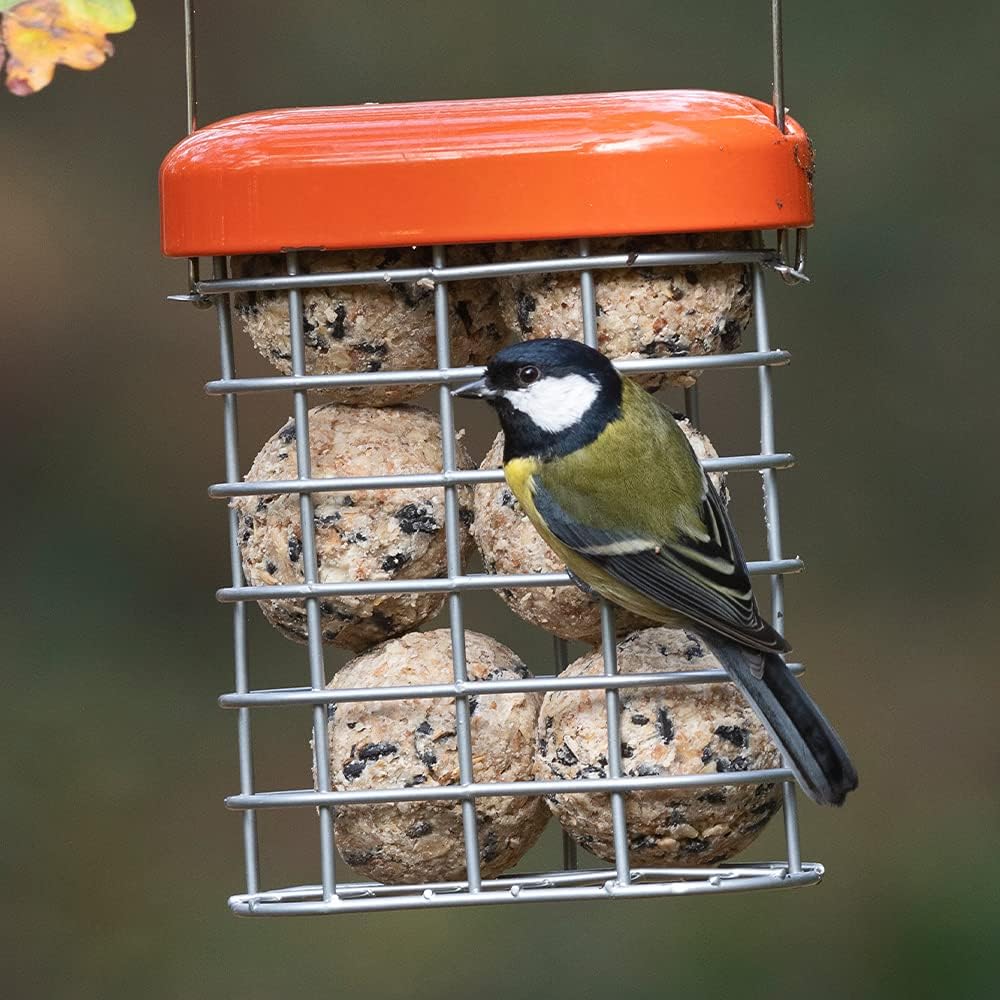 [Durable Steel Cage Design] Protects up to two suet cakes or six fat balls, This fat ball suet feeder is made to last in chew-proof metal to prevent unwanted damage from squirrels and pigeons