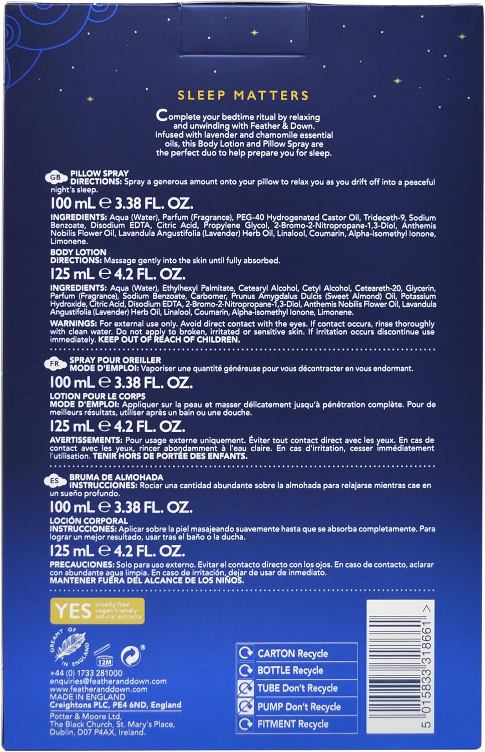 Feather & Down Mothers Day Gifts Bathtime Bliss Gift Set (Shower Cream, Pillow Spray, Bath Essence & Body Lotion) - Bath Set With Lavender & Chamomile Essential Oils. Vegan Friendly & Cruelty Free
