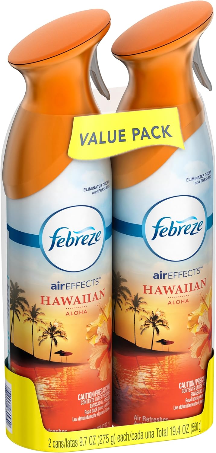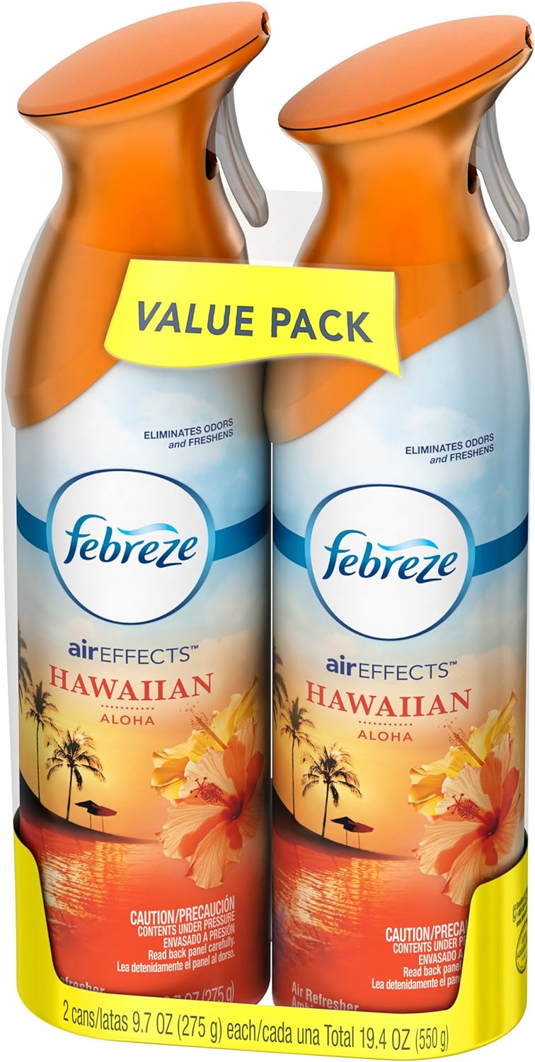 Doesn't just mask, truly eliminates odors10Febreze Air Effects air freshener instantly eliminates odors while freshening the air10A lush, tropical Hawaiian Aloha scent10The fine mist infuses the air with freshness that is subtle, never overpowering10100% natural propellant is safe to use around cats and dogs, but as with other air care products, do not use around birds