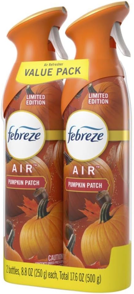 Febreze Air Effects Odor-Fighting Air Freshener Pumpkin Patch brings on in the feel of fall sweater weather without the worries of wind10Febreze Air Effects Odor-Fighting Air Freshener is perfect for any room in your home and can be used on fabrics, upholstery, and carpets to eliminate tough odors10Febreze Air Effects Odor-Fighting Air Freshener is safe to use around pets and children and does not contain any harsh chemicals or perfumes10Febreze Air Effects Odor-Fighting Air Freshener is easy to use and simply sprays to freshen up your space10Febreze Air Effects Odor-Fighting Air Freshener comes in a pack of 2, so you can keep one in your home and one in your office or car