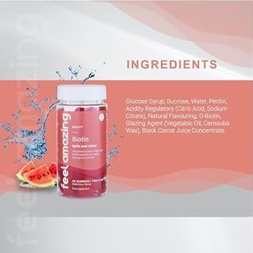 Feel Amazing Biotin Gummies - 10000µg Biotin Per Serving - Vegan - Supports Skin Function & Hair Health - Watermelon Flavour - 60 Gummies