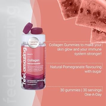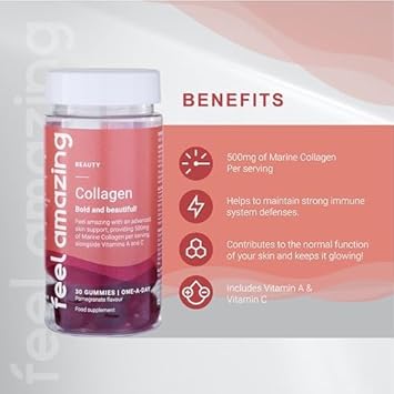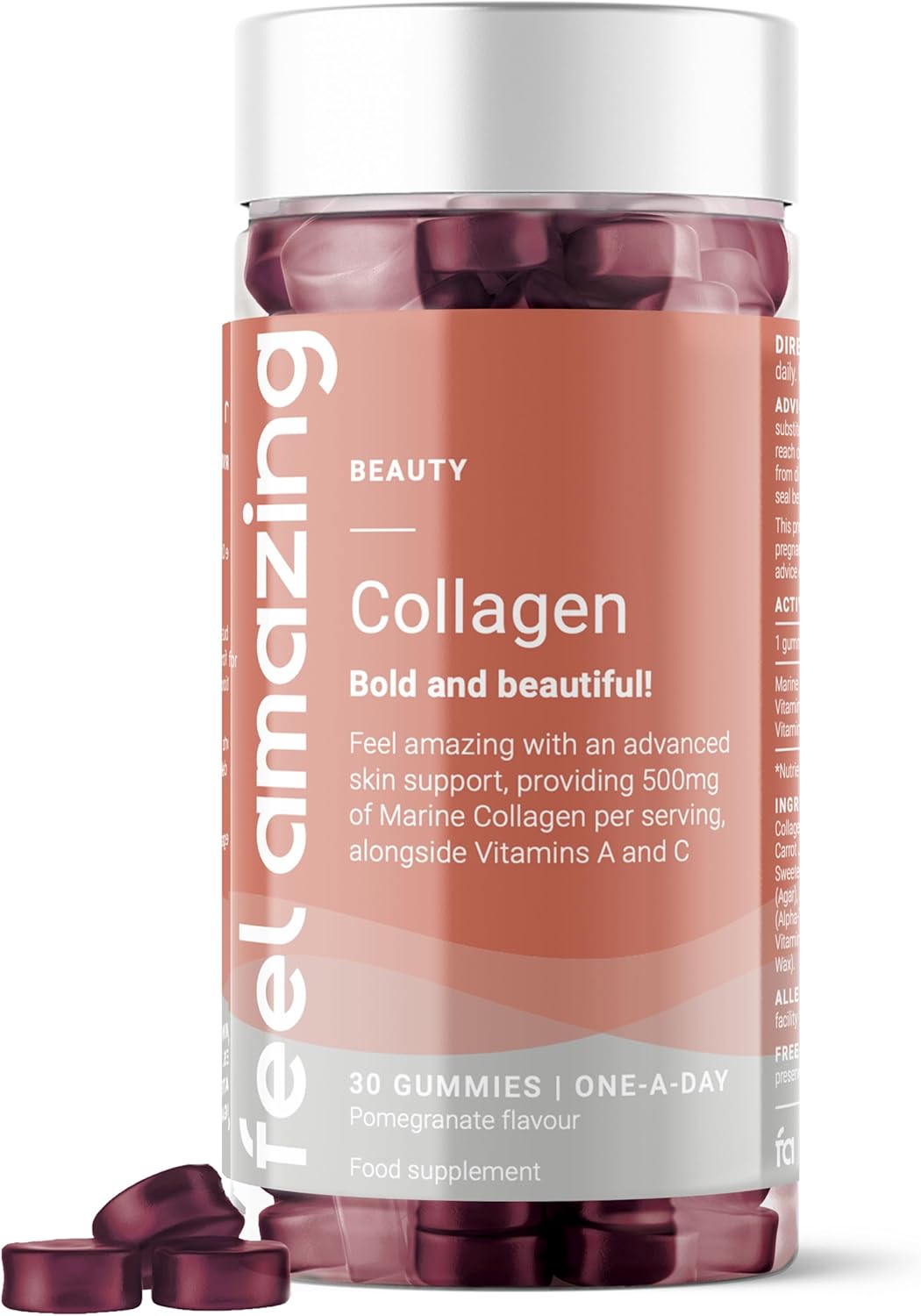 Feel Amazing Collagen Gummies With Vitamins A & C - 500Mg Of Marine Collagen Per Serving - Advanced Skin Support - 30 Gummies - 1 Month Supply