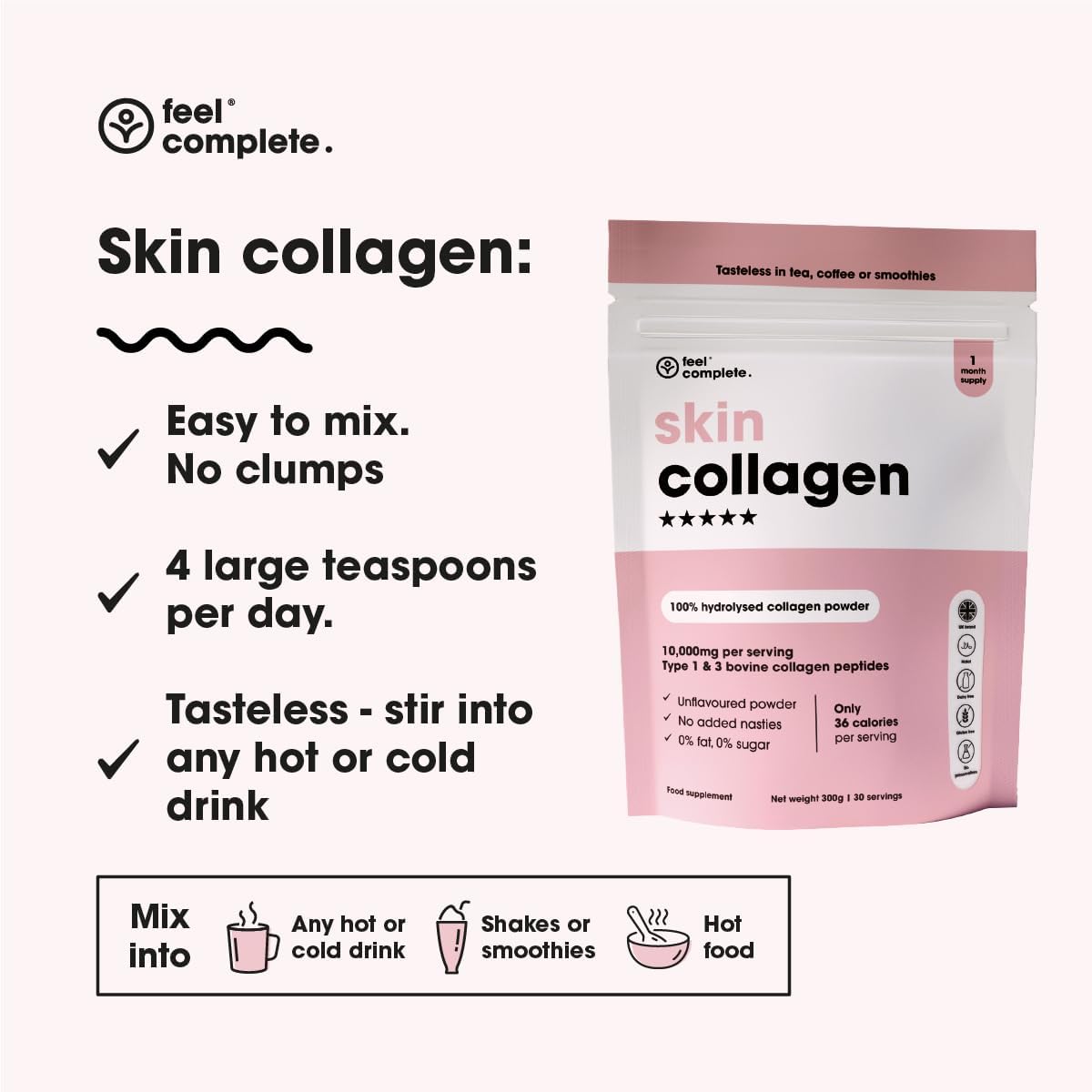 Feel Complete | Tasteless Collagen For Women | Grass Fed & Hydrolysed | Low Calorie | Premium Type 1 & 3 Bovine Collagen Peptides | Halal | Anti Ageing | Hair, Skin & Muscles | 300G | 30 Servings