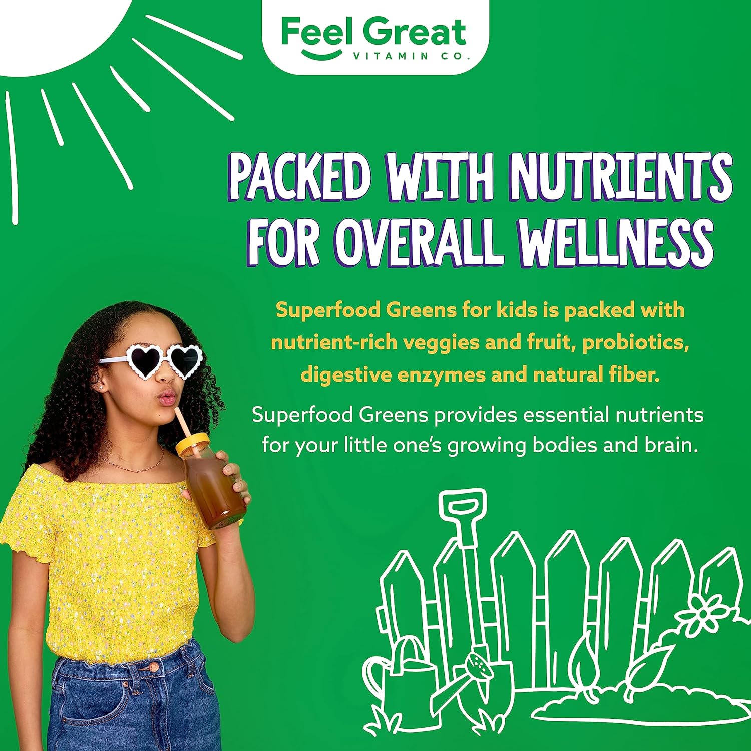 DESCRIPTION : Feel Great USDA Organic Super Greens for Kids | Vegan Chocolate Greens Powder with Veggie Powder for Kids | Superfood Powder with Probiotics & Digestive Enzymes for Digestive Health | 2 Month Supply