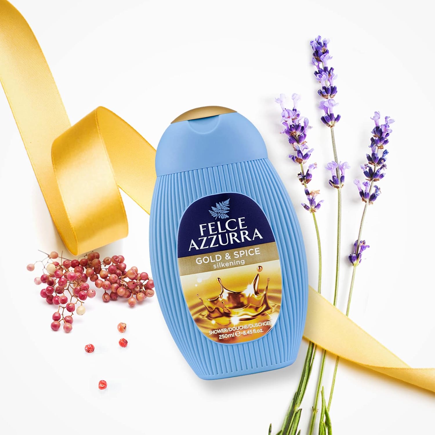 Felce Azzurra Gold And Spices - Silkening Essence Shower Gel - Blend With Fruity And Aromatic Notes - Leaves Your Skin Soft And Pleasantly Perfumed - Shower Gel Is Dermatologically Tested - 8.4 Oz