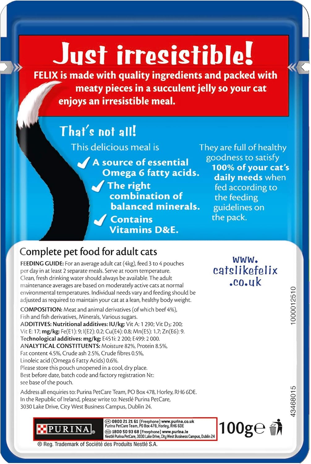 ^ Felix Adult Wet Cat Food Beef in Jelly 20 x 100g Pouches ^ Includes vitamins D and E, Omega 6 and mineral blend ^ Tasty meaty chunks in an irresistible jelly ^ Designed by experts in pet nutrition using quality ingredients ^ 20 x 100g pouches