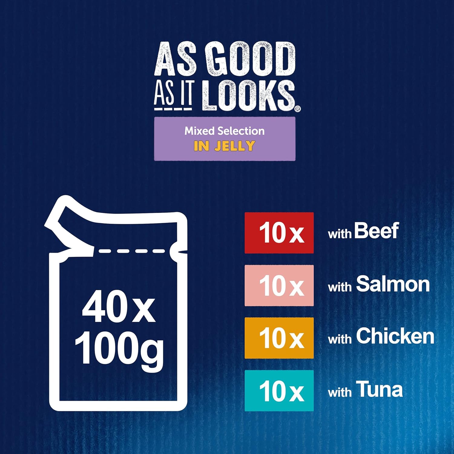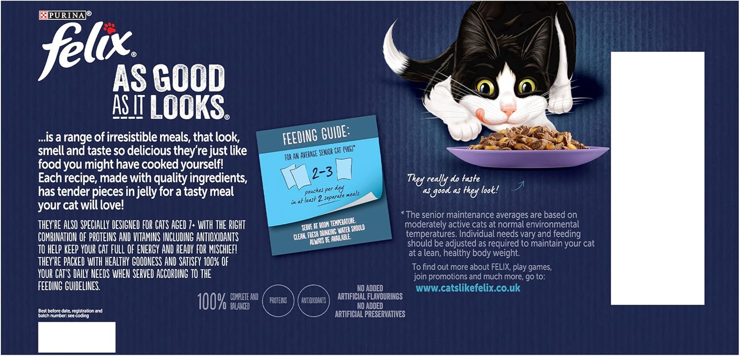 ^ Felix As Good As It Looks 7+ Senior Wet Cat Food Mixed in Jelly Beef, Salmon, Chicken, Tuna 40 x 100g Pouches ^ Irresistible meals for mischief makers ^ 100% of your cat's daily needs antioxidants, balanced minerals, and proteins ^ No added artificial flavourings, preservatives and colourants ^ Suitable for all breeds ^ 40 x 100g