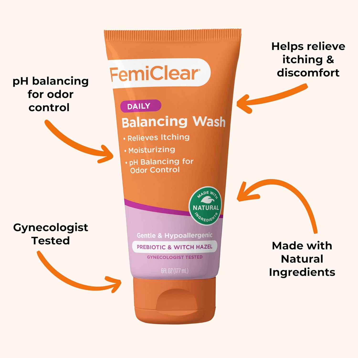 About this item Gentle Cleansing: FemiClear Feminine Wash is a gentle, pH-balancing wash that cleanses the vulva and helps restore pH balance. Safe Ingredients: Formulated without harsh chemicals like sulfates, parabens, and artificial fragrances, making it safe for sensitive skin. Prebiotic Blend: Contains a unique prebiotic blend that helps soothe irritation and maintain pH balance. Easy to Use: Simply apply to the vulva in the shower or bath and rinse thoroughly with water. Maintains Balance: Helps restore vaginal pH balance when it's out of sync, providing soothing relief from itching and irritation. See more product details,Gentle Cleansing: FemiClear Feminine Wash is a gentle, pH-balancing wash that cleanses the vulva and helps restore pH balance,Safe Ingredients: Formulated without harsh chemicals like sulfates, parabens, and artificial fragrances, making it safe for sensitive skin,Prebiotic Blend: Contains a unique prebiotic blend that helps soothe irritation and maintain pH balance,Easy to Use: Simply apply to the vulva in the shower or bath and rinse thoroughly with water,Maintains Balance: Helps restore vaginal pH balance when it's out of sync, providing soothing relief from itching and irritation