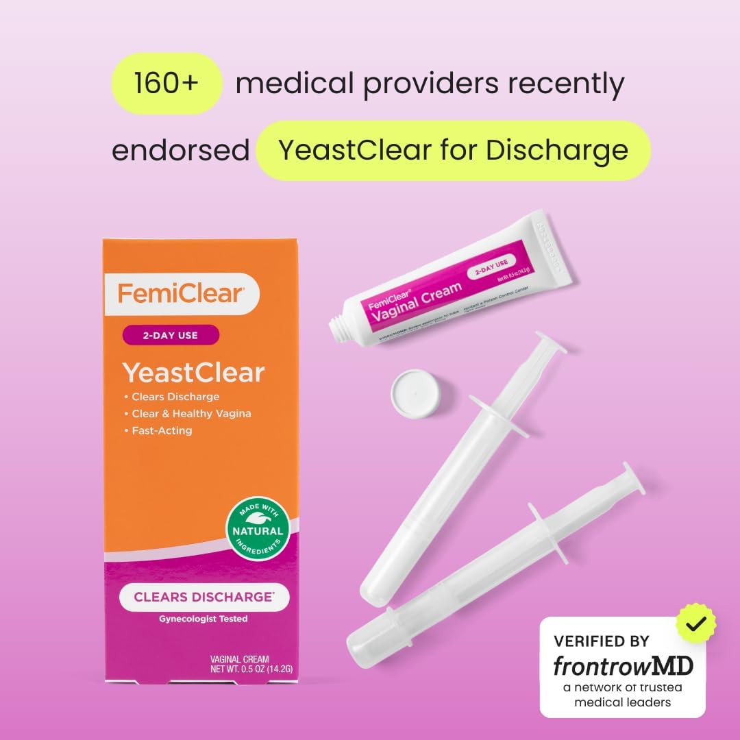 About this item YeastClear is a NEW innovative cream that targets and neutralizes vaginal discharge, providing fast soothing relief. Some say it’s our best formula yet! YeastClear is designed for women dealing with unwanted vaginal discharge. Our innovative, natural formula provides a gentle and non-irritating way to address these concerns. In our consumer study, 96% of users reported YeastClear provided much needed relief* *data on file FemiClear harnesses the power of our patented certified organic olive oil oxygenation process creating a gentle cream that is non-irritating and fast-acting. 91% of users experienced relief in the first 24 hours!* *data on file FemiClear discharge clearing vaginal cream has a gentle formula that is non-irritating. It has been Gynecologist Tested to ensure safety and efficacy for all users. Experience the confidence and comfort that comes with feeling fresh and discharge free. Trust FemiClear to provide the natural, effective relief you deserve. See more product details,YeastClear is a NEW innovative cream that targets and neutralizes vaginal discharge, providing fast soothing relief. Some say it’s our best formula yet!,YeastClear is designed for women dealing with unwanted vaginal discharge. Our innovative, natural formula provides a gentle and non-irritating way to address these concerns. In our consumer study, 96% of users reported YeastClear provided much needed relief* *data on file,FemiClear harnesses the power of our patented certified organic olive oil oxygenation process creating a gentle cream that is non-irritating and fast-acting. 91% of users experienced relief in the first 24 hours!* *data on file,FemiClear discharge clearing vaginal cream has a gentle formula that is non-irritating. It has been Gynecologist Tested to ensure safety and efficacy for all users,Experience the confidence and comfort that comes with feeling fresh and discharge free. Trust FemiClear to provide the natural, effective relief you deserve