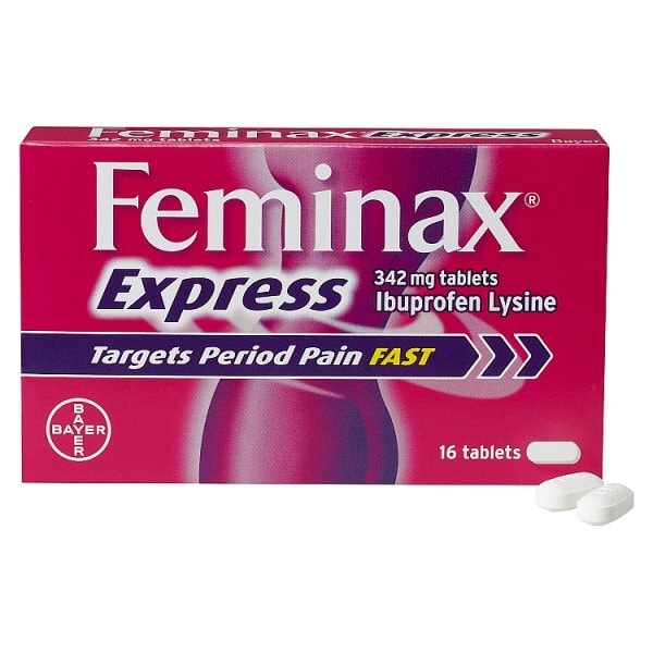 Product Information:Feminax Express Period Pain & Cramps Tablets provide fast relief from period pain and associated symptoms. Contains Ibuprofen Lysine,Warning or Restrictions:- Consult your doctor or pharmacist if you have an underlying medical condition, are taking any other medication or complementary therapy, or if symptoms persist. - Seek advice if you suffer from allergies. - Keep all medicines out of the reach of children,Product Specification:200 mg Ibuprofen (as Ibuprofen lysine),Product Uses:For oral use. Swallow the tablets whole with water. Do not chew. Adults, the elderly and children over 12 years: Initially take 1 or 2 tablets with water, then if necessary take 1 or 2 tablets every 4 hours. Leave at least 4 hours between doses. Do not exceed 6 tablets in 24 hours,Recyclable:Bottle, box and leaflet can all be recycled