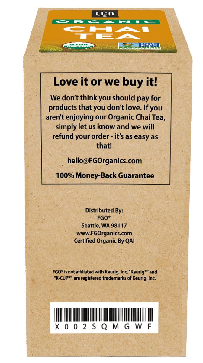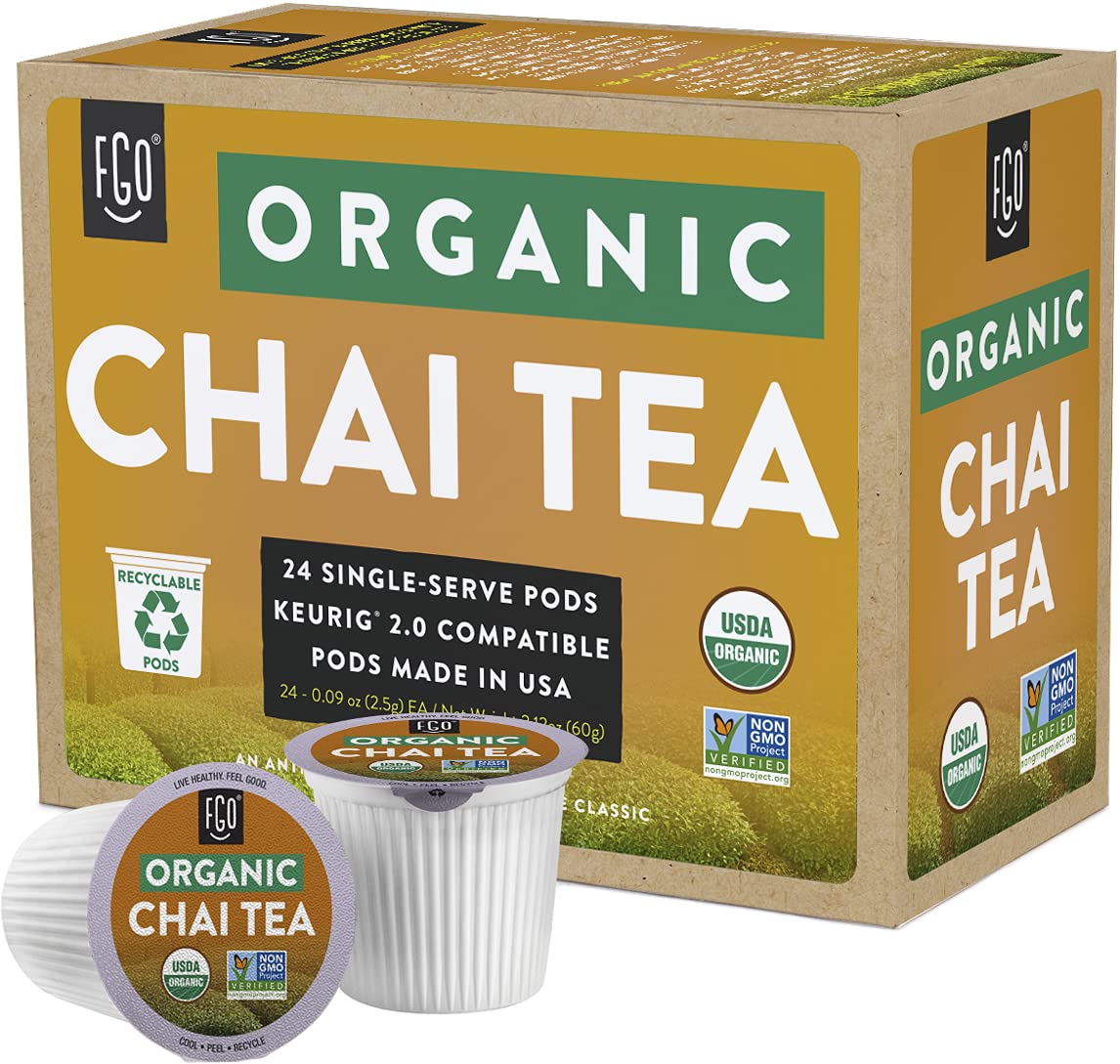 Fgo Organic Chai Black Tea K-Cup Pods For Keurig, 24 Count (Pack Of 1), Premium Black Tea With Chai Spice Is Usda Organic, Non-Gmo, & Recyclable With Naturally Occurring Caffeine