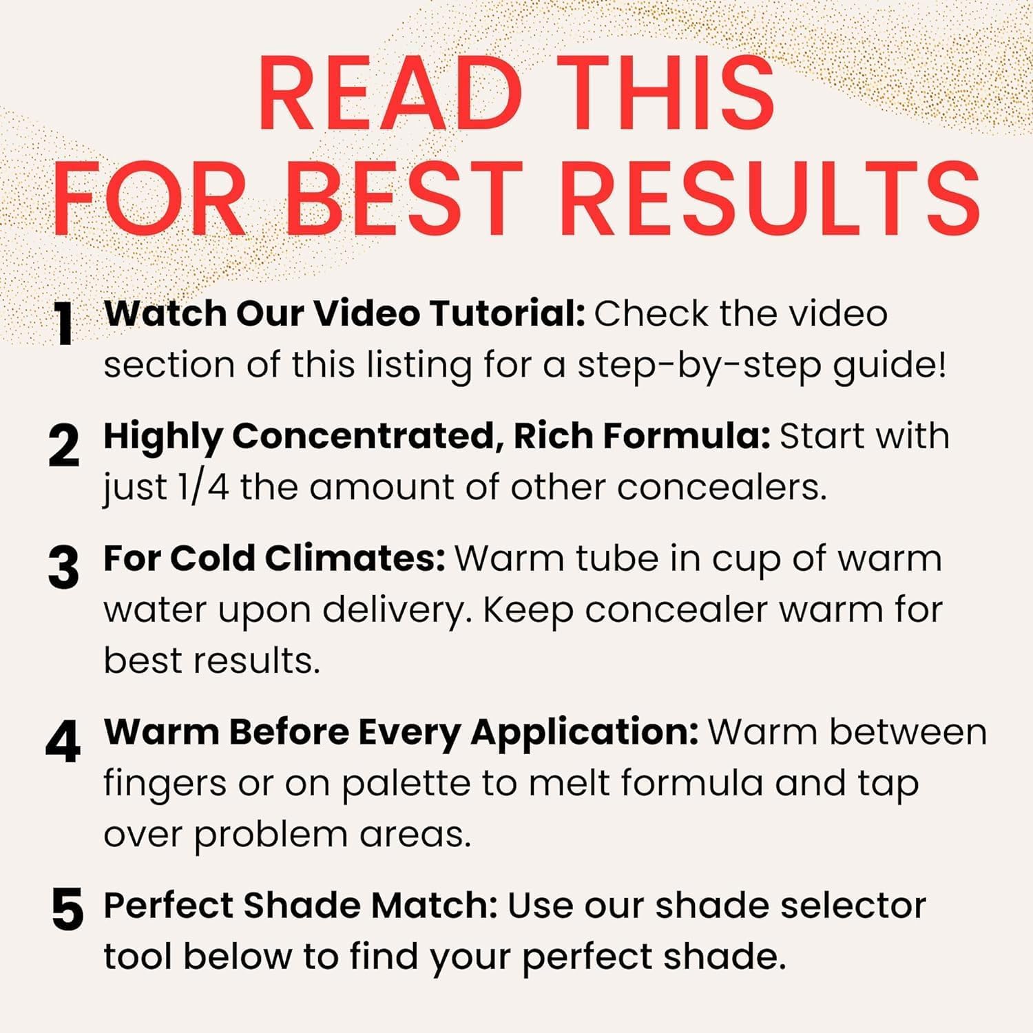 Read This For Best Results - Use only 1/4 the amount of typical concealers; warm on fingers or a palette until it melts for flawless application. Use our shade selector tool to find your perfect match. For cold climates, keep the product warm before use, and visit our video section for a step-by-step tutorial