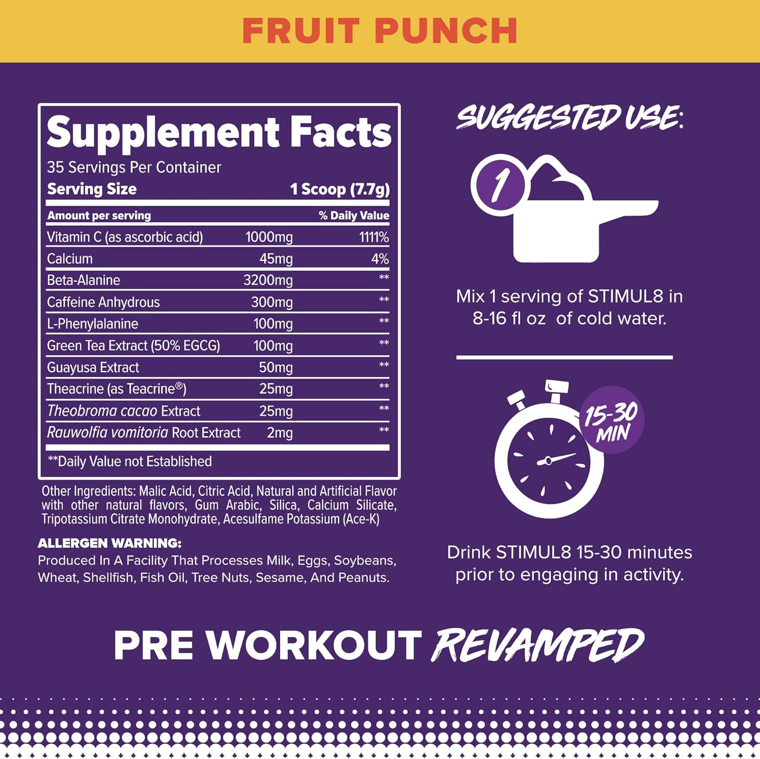 About this item ORIGINAL PRE-WORKOUT - STIMUL8 is the Original Pre-Workout designed to provide the energy, strength & endurance needed to take your workout to the next level! Built for both men & women, our formula has remained virtually unchanged for 5 years. STRIVE TO BE GREAT - It's important to find a pre-workout that helps you achieve your fitness goals. Benefits of STIMUL8 include: increased endurance, extra energy, heightened focus & concentration, and even reduced muscle soreness after workouts. ACTIVE INGREDIENTS - With 300mg caffeine, 1000mg vitamin C & IrisinXD (found only in FINAFLEX products), you'll have what it takes to conquer any obstacle. Don't spend hours at the gym—just one scoop of STIMUL8 helps you make the most of each second. WHY DO I NEED A PRE-WORKOUT - Pre-workout supplements can help you perform better during your workouts, make your workout feel easier, and help you finish your workout strong, without feeling drained. WHO WE ARE - FINAFLEX is a snack & supplement company founded in 2008 and based out of Atlanta, GA. As a GMP-Certified manufacturer, we are committed to delivering unique, effective, high-quality products that help people achieve their fitness goals. See more product details,ORIGINAL PRE-WORKOUT - STIMUL8 is the Original Pre-Workout designed to provide the energy, strength & endurance needed to take your workout to the next level! Built for both men & women, our formula has remained virtually unchanged for 5 years,STRIVE TO BE GREAT - It's important to find a pre-workout that helps you achieve your fitness goals. Benefits of STIMUL8 include: increased endurance, extra energy, heightened focus & concentration, and even reduced muscle soreness after workouts,ACTIVE INGREDIENTS - With 300mg caffeine, 1000mg vitamin C & IrisinXD (found only in FINAFLEX products), you'll have what it takes to conquer any obstacle. Don't spend hours at the gym—just one scoop of STIMUL8 helps you make the most of each second,WHY DO I NEED A PRE-WORKOUT - Pre-workout supplements can help you perform better during your workouts, make your workout feel easier, and help you finish your workout strong, without feeling drained,WHO WE ARE - FINAFLEX is a snack & supplement company founded in 2008 and based out of Atlanta, GA. As a GMP-Certified manufacturer, we are committed to delivering unique, effective, high-quality products that help people achieve their fitness goals