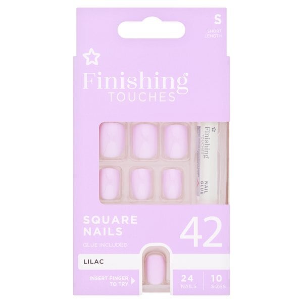 Product Information:S/D Finishing Touches Lilac, Short, Square,Warning Or Restrictions:Glue Warning: Contains Cyanoacrylate. Danger. Bonds Skin In Seconds. Keep Out Of Reach Of Children. Causes Skin Irritaton. May Cause Respiratory Irritation. Avoid Breathing Fumes And Vapours. Use Only Outdoors Or In Well-Ventilated Area. If Medical Advice Is Needed, Have Product Container Or Label At Hand. Eye Irritant: Bonds Skin And Eyes Instantly. If Skin Bonds Do Not Pull - Soak In Warm Water Or Use Nail Polish Remover And Peel Gently Apart. If Eye Contact Occurs Rinse Immediately With Plenty Of Water And Seek Medical Advice. If Swallowed Seek Medical Advice And Keep Hold Of This Packaging. Avoid Contact With Clothing As It Can Cause Burns. Do Not Use On Weak, Irritated, Or Infected Nails. Use Only As Directed. Do Not Store With Eye Products Or Medicines,Product Specification:Ethyl Cyanoacrylate, Polymethyl Methacrylate, Bha, Tocopherol, Panthenol, Retinyl Palmitate, Ci 15850,Product Uses:Glam Your Nails In Minutes, With 12 Sizes To Fit Over Your Natural Nails For The Perfect Manicured Look, Day And Night. Application 1.Prepare Nail By Buffing First And Then Pushing Back Cuticles With The Manicure Stick Provided. 2.Follow Up With Cleaning And Drying Natural Nails. 3. Pre-Select The Nails Using The Numbers That Closely Match The Size Of Your Own Nails And Line Them Up In The Sequence In Which You Wish Apply Them. 4.Carefully Apply A Thin Layer Of The Glue To Either Your Natural Nails Or False Nails One At A Time. Position The False Nail On Your Natural Nail, Just Above The Cuticle And Hold Down Firmly For At Least 30 Seconds Until Completely Bonded. 5.Wipe Excess Glue With A Damp Superdrug Cotton Bud* And Repeat Process On All Nails. Removal 1.First Cut Down The Edge Of Your Artificial Nails. 2.Soak Nails Using Superdrug Soak Off Nail Clips* Individually In Superdrug Artificial Nail Remover*Until The Nails Start To Loosen. Wipe Away Any Remaining Residue. Do Not Force Or Pull Off Any False Nails As This Will Damage Your Own Natural Nails. 3.Wash Hands Thoroughly, Then Apply Superdrug Nail And Cuticle Oil* Or Superdrug Nail Cuticle Cream* And Gently Massage Into Your Nails To Help Condition And Protect Them Against Brittleness. * All Sold Separately,Recyclable:Box - Fsc Paper - Widely Recycled; Insert Tray - Poyethylene Terephthalate - Check Local Recycle Guidelines , Bottle - Check Local Recycle Guidelines