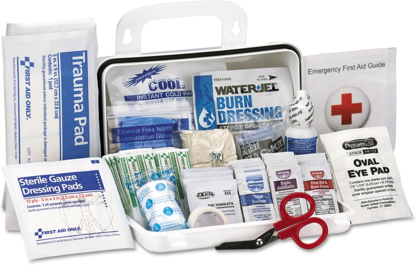 This compact first aid kit prepares you to tackle immediate minor injuries. The perfect first aid kit for cars, homes, and offices, this 71-piece kit includes supplies for treating pain and swelling, as well as cuts, scrapes, and burns. This small first aid kit is easy to carry and compact and includes individual compartments designed to neatly store everything. Ideal for home, traveling, and taking on the go, our first aid kits for businesses, homes, and cars allow you to treat minor cuts and scrapes just about anywhere,Comprehensive Emergency Kit: Includes adhesive fabric and plastic bandages, antibiotic ointments, BZK antiseptic towelettes, gauze roll and pads, gloves, scissors, tweezers, and other multi-use first aid items including a 1-ounce eye wash,Convenient Packaging: An ideal workplace or home first aid kit, it features a durable plastic case complete with an easy-to-carry handle for transporting first aid supplies in an emergency,Easy Access: This convenient and versatile work, home and car emergency kit features individual compartments that make accessing first aid supplies quick and easy,Compact Size: Small enough to fit nicely into a backpack, vehicle compartment, or desk drawer, this travel-size first aid kit helps you stay prepared for potential emergencies at home, in the office, or while on the go,Personal and Professional First Aid Solutions: First Aid Only offers a full line of first aid kits, cabinets, and stations, Emergency Response Care, individual first aid products, Spill Clean Up kits, CPR care and more
