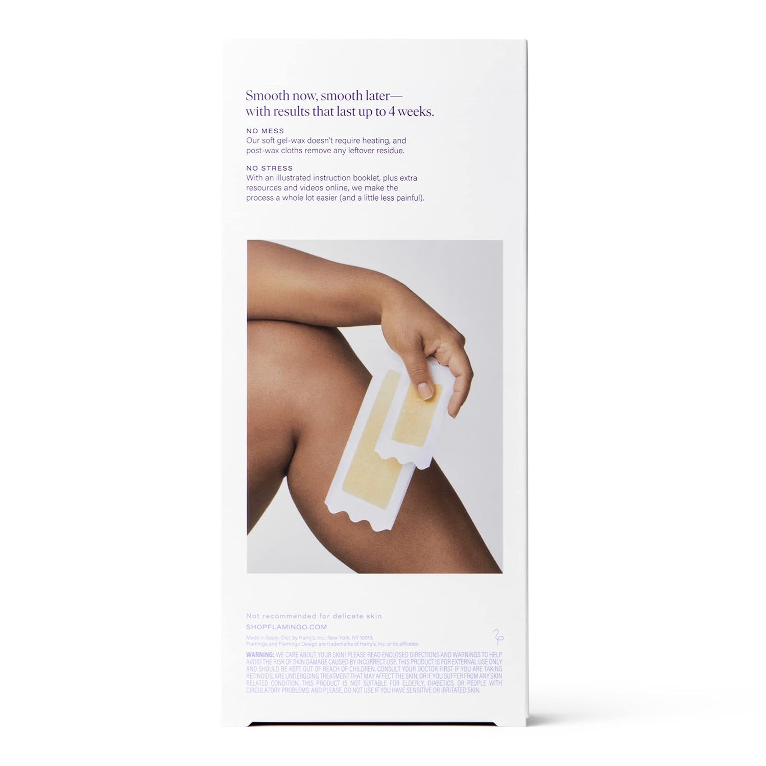 Get smooth at home with our soft gel-wax strips, designed to grab even the finest and shortest of hairs from the root for long-lasting results. Our at-home wax kit includes 20 large (10 double-sided) and 8 medium (4 double-sided) wax strips, plus 6 post-wax clothes to soothe and calm skin. Each wax strip is good for at least two pulls. Our strips come ready to use, which means an easier, cleaner experience with no heating or slathering wax onto a stick. The wax strips are made with a wavy edge to easily separate the strips from each other. Our plush post-wax cloths are made with sweet almond oil to help you gently remove stickiness and restore skin after waxing. And if you're new to waxing, we're here for you. Each kit includes step-by-step illustrated instructions. We've thought of everything, so you don't have to!BODY WAX STRIPS: The FLAMINGO Body Wax Kit is designed for an easy at-home hair removal experience. These no-heat body wax strips come with thorough instructions to make the process a little less intimidating. This waxing kit is a great hair removal option for your legs, arms, and underarms. Skip the salon—waxing your body at home just got a lot easierGET EVERY HAIR : Gel-wax formula removes the finest, shortest, and spikiest of hairs (as short as 2 mm)POST-WAX CARE: Includes Post-Wax Cloths to soothe and restore skinDERMATOLOGIST TESTED: Made without parabens, sulfates, or mineral oil. No added fragrance or artificial colors