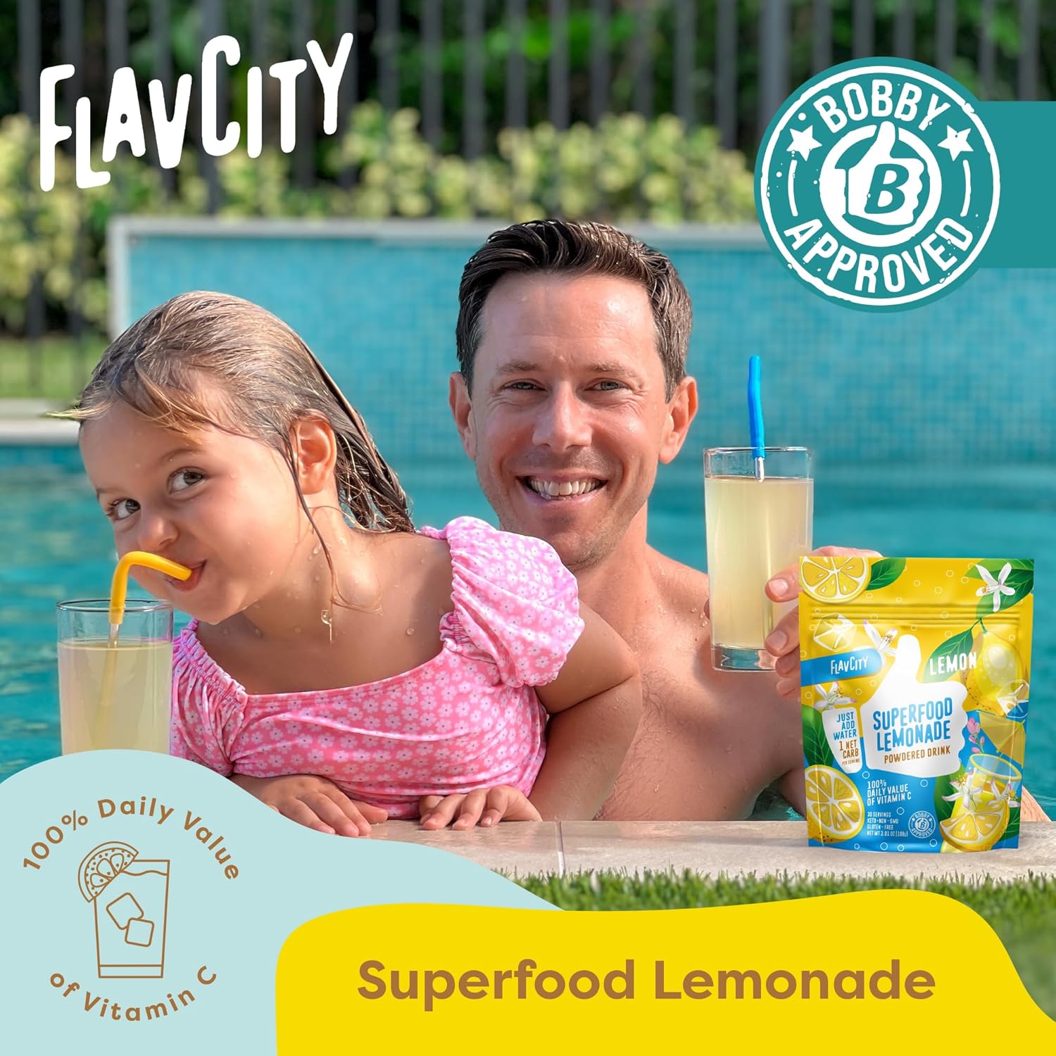 About this item Delicious & Sugar-Free - FlavCity’s Pink Grapefruit Superfood Lemonade is a tasty twist on the drink you grew up on, without the sugar crash. It's naturally sweetened with premium stevia, contains just 1 net carb per serving and delivers plenty of Vitamin C. Made with Real Ingredients - This powdered drink mix combines crystallized grapefruit and acerola, plus red beet root powder for a natural pink color. Each serving delivers 100% of your daily Vitamin C for stellar immune support in a bright citrus taste. Easy to Mix & Enjoy - Add one scoop of this lemonade mix to 8oz of water, stir and enjoy. Great for barbecues, pool parties, picnics, or a post-workout treat. Try combining it with sparkling water or our Lemon Ginger Immunity Tea for an extra boost. Non-GMO & Keto-Friendly - Our lemonade powder uses real fruit-sourced flavors for the perfect combination of taste and function. No artificial flavors, colors, or sweeteners — perfect for health-conscious individuals, keto dieters, and those avoiding sugar-laden beverages. I'd Scoop That - Since 2012, Bobby Parrish has helped people understand exactly what they're putting in their bodies so they can thrive. Now, with a following of more than 12 million community members, he's dedicated to creating delicious, streamlined powdered drink mixes to help enhance your health journey. See more product details,Delicious & Sugar-Free - FlavCity’s Pink Grapefruit Superfood Lemonade is a tasty twist on the drink you grew up on, without the sugar crash. It's naturally sweetened with premium stevia, contains just 1 net carb per serving and delivers plenty of Vitamin C,Made with Real Ingredients - This powdered drink mix combines crystallized grapefruit and acerola, plus red beet root powder for a natural pink color. Each serving delivers 100% of your daily Vitamin C for stellar immune support in a bright citrus taste,Easy to Mix & Enjoy - Add one scoop of this lemonade mix to 8oz of water, stir and enjoy. Great for barbecues, pool parties, picnics, or a post-workout treat. Try combining it with sparkling water or our Lemon Ginger Immunity Tea for an extra boost,Non-GMO & Keto-Friendly - Our lemonade powder uses real fruit-sourced flavors for the perfect combination of taste and function. No artificial flavors, colors, or sweeteners — perfect for health-conscious individuals, keto dieters, and those avoiding sugar-laden beverages,I'd Scoop That - Since 2012, Bobby Parrish has helped people understand exactly what they're putting in their bodies so they can thrive. Now, with a following of more than 12 million community members, he's dedicated to creating delicious, streamlined powdered drink mixes to help enhance your health journey