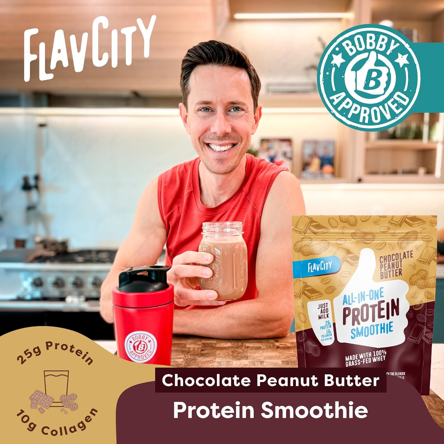 Ditch The Blender: FlavcityâS Chocolate Peanut Butter Protein Smoothie Is A Delicious And Nutrient-Dense Blend Of Peanut Butter And Real Cocoa. WeâVe Simplified The Smoothie-Making Process By Incorporating All The High-Quality Ingredients You Love In Each Scoop â No Add-Ins Needed! With 25G Of Protein Per Serving, Our Complete Protein Smoothies Are Sure To Be Your New Go-To Post-Workout Beverage Or Snack. 20 Servings