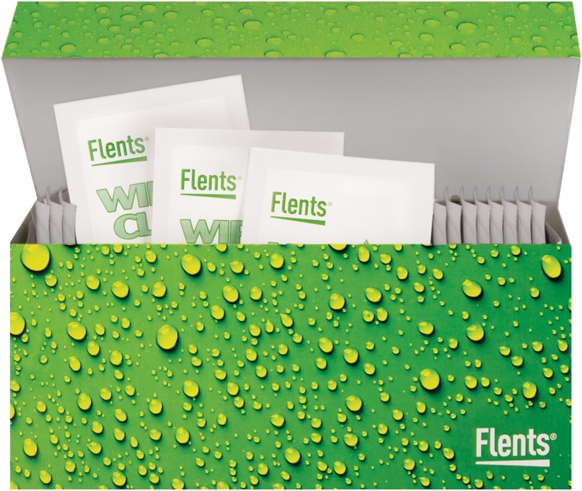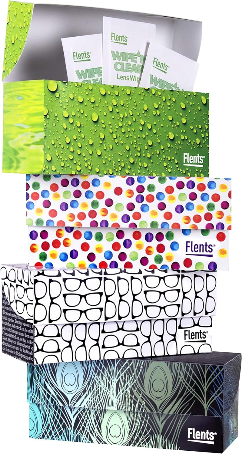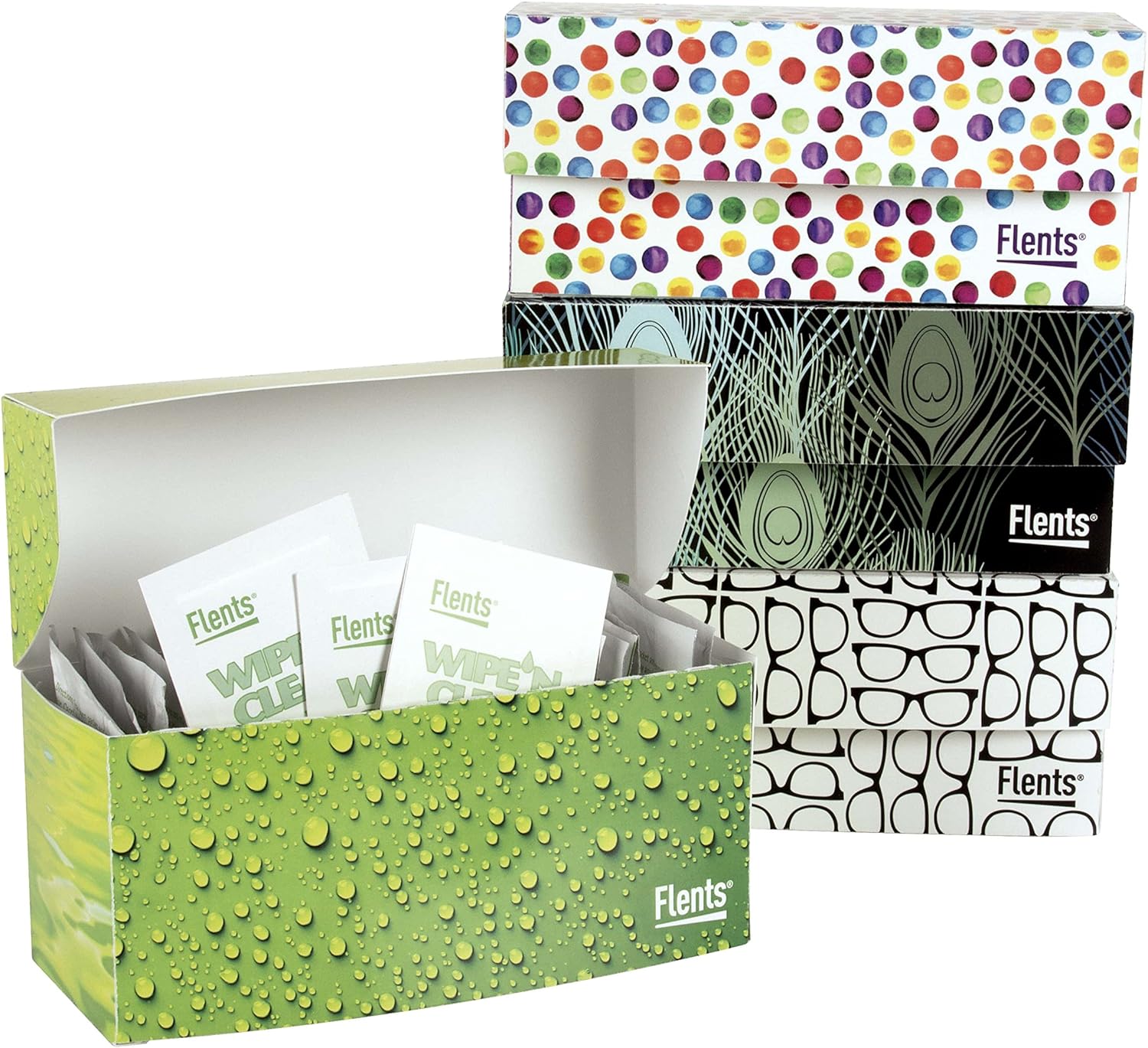 MULTI-PURPOSE: Lens and glasses cleaner can also be used to clean off dirt, dust or other grimeCLEANS FOR CLARITY - Our lens wipes are designed to clean glass and plastic lenses for extreme claritySOFT-QUILTED WIPES: Softer wipes for gentle and easy cleaningANTI-STREAK: Anti-Steak with a fast drying formulaDO NOT FLUSH: These wipes are to be disposed in the garbage after useFlents Lens Wipes are ideal for cleaning all types of optical products including anti-reflective (A/R) coated lenses. The anti-streak formula lifts off smudges, dust, lint and dries instantly. The soft-quilted lens wipes are individually wrapped and are great for travel and on-the-go convenience. The decorative box comes in four different designs and can be displayed in any room of the house, at work or in the car. The four designs are; Feathers, Glasses, Marbles and Rain Forest. Directions: Before cleaning optical lenses, remove any harmful surface grit or dirt by lightly wiping or brushing away. Flents Lens Wipes will not scratch lenses. Use the pre-moistened lens wipe to polish the lens surface clean. Warning: Avoid contact with eyes. Not for use on contact lenses. Keep out of reach of children. Ingredients: Water, Isopropyl Alcohol, Detergent