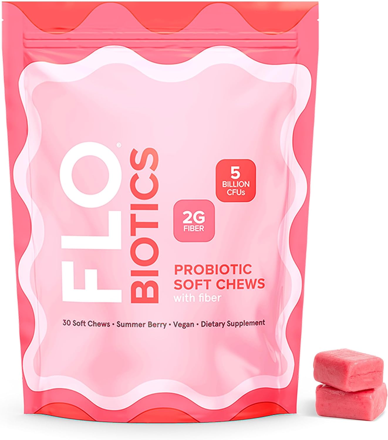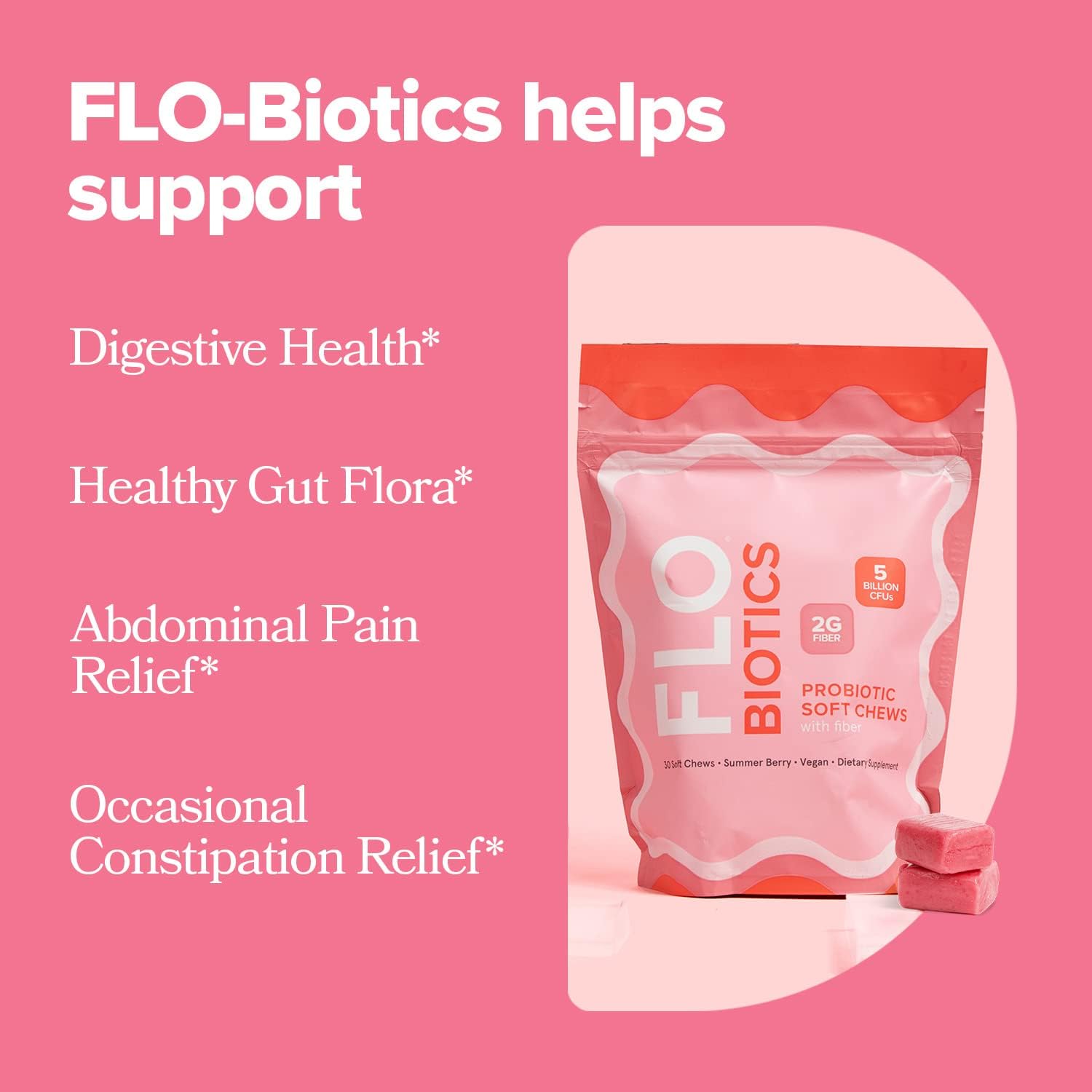 Support Digestive Health: Each delicious soft chew is packed with probiotics and fiber to help keep your immune system healthy and gut in balance. Our soft chew probiotic gummy supplement can also relieve occasional constipation while supporting your immune system at the same time. These berry flavored probiotic chewables come individually wrapped, so they are easy and convenient on the go!Can Help Relieve Bloating and Gas: Taking one probiotic soft chew daily can help with occasional bloating, gas relief, indigestion and gastric discomfort. After taking FLO-Biotics you won’t want to go without themPromote Healthy ??Gut Flora: Each FLO-Biotics soft chew contains 2g of fiber and 5 billion CFUs of Bacillus coagulans, a digestive probiotic that can help with bloating discomfort. Everything you need in one delicious summer berry chewRelieve Occasional Constipation: Our digestive probiotic and premium fiber blend can support good bacteria and immunity while getting you your daily fiber supplement. Get your daily dose of fiber with clean ingredients for a happy gut