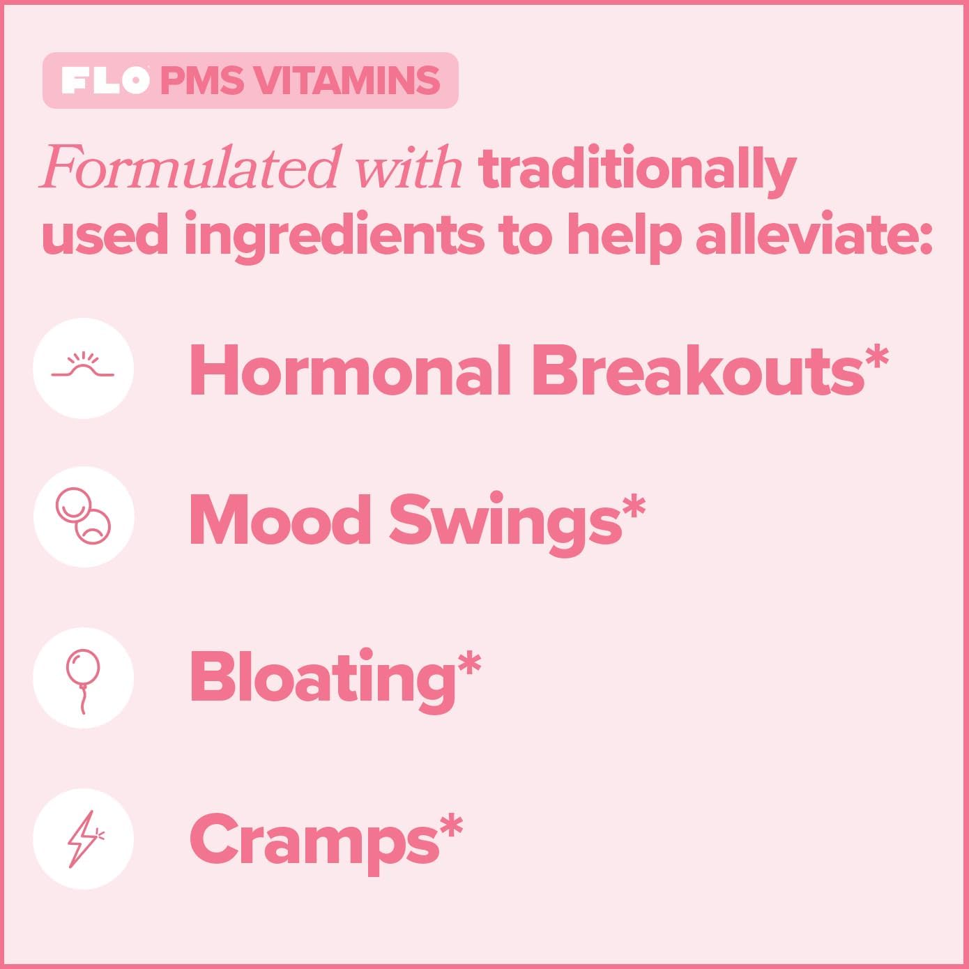 Flo Pms Vitamins For Women, 30 Servings (Pack Of 3) - Proactive Pms Relief - Targets Hormonal Breakouts, Bloating, Cramps, & Mood Swings With Chasteberry, Vitamin B6, & Lemon Balm