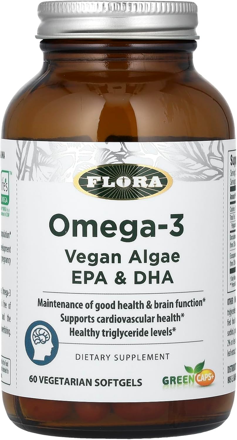 About this item PLANT-BASED OMEGA-3S: Flora Omega Brain+ is the best replacement for fish oil DHA and EPA omega-3s that is vegan/vegetarian friendly. Take these to support your brain, triglyceride levels, and cardiovascular health! NO MIDDLE-MAN: Fish get their omega-3s from eating algae. So, we cut out the middleman and went straight to the source, saving the fish and giving you a powerful DHA oil in a vegetarian capsule with no additives or preservatives SUSTAINABLY SOURCED: Our DHA Algae is tank-grown meaning we don’t take from the ocean’s resources. It also means our algae is naturally free of ocean-borne contaminants like PCB’s, dioxins, and mercury. Safe for children 9+ and pregnant women Gluten-Free + Non-GMO + Vegan See more product details,PLANT-BASED OMEGA-3S: Flora Omega Brain+ is the best replacement for fish oil DHA and EPA omega-3s that is vegan/vegetarian friendly. Take these to support your brain, triglyceride levels, and cardiovascular health!,NO MIDDLE-MAN: Fish get their omega-3s from eating algae. So, we cut out the middleman and went straight to the source, saving the fish and giving you a powerful DHA oil in a vegetarian capsule with no additives or preservatives,SUSTAINABLY SOURCED: Our DHA Algae is tank-grown meaning we don’t take from the ocean’s resources. It also means our algae is naturally free of ocean-borne contaminants like PCB’s, dioxins, and mercury. Safe for children 9+ and pregnant women,Gluten-Free + Non-GMO + Vegan