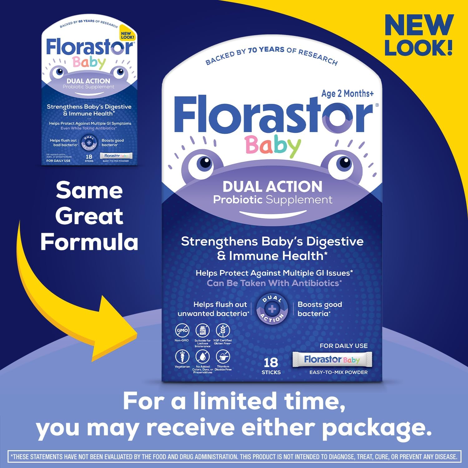 About this item Daily Probiotic For Babies: This probiotic naturally restores gut balance by flushing bad bacteria; Safe for baby with non-GMO ingredients and no added colors, dyes, preservatives or flavoring Digestive and Immune Support: Florastor helps your baby absorb precious water and nutrients by increasing the natural flora in the digestive tract and supports overall health by strengthening digestive balance and gently stimulating immunity The Probiotic of Choice: Florastor is the number 1 probiotic in its around the world; We use a unique and effective probiotic strain with over 65 years of use and research Antibiotic Resistant: Our resilient probiotic formula thrives even during antibiotic use, with proven resistance to 16 of the most common oral antibiotics so it can help restore your baby's gut flora balance Made with ingredients that are vegetarian, gluten-free, titanium dioxide free and appropriate for lactose intolerance See more product details,Daily Probiotic For Babies: This probiotic naturally restores gut balance by flushing bad bacteria; Safe for baby with non-GMO ingredients and no added colors, dyes, preservatives or flavoring,Digestive and Immune Support: Florastor helps your baby absorb precious water and nutrients by increasing the natural flora in the digestive tract and supports overall health by strengthening digestive balance and gently stimulating immunity,The Probiotic of Choice: Florastor is the number 1 probiotic in its around the world; We use a unique and effective probiotic strain with over 65 years of use and research,Antibiotic Resistant: Our resilient probiotic formula thrives even during antibiotic use, with proven resistance to 16 of the most common oral antibiotics so it can help restore your baby's gut flora balance,Made with ingredients that are vegetarian, gluten-free, titanium dioxide free and appropriate for lactose intolerance