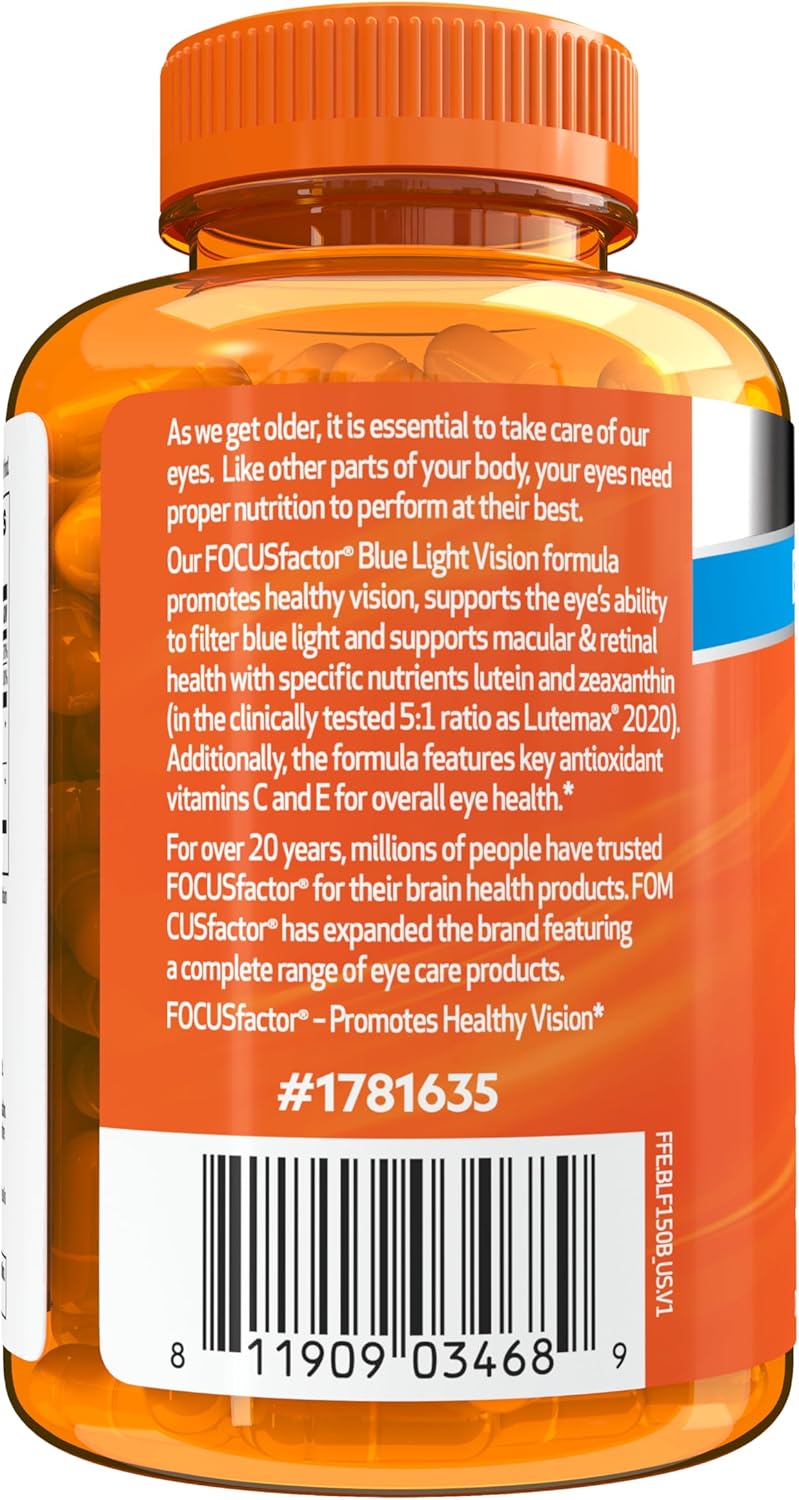 About this item BLUE LIGHT FORMULA: Support your vision with Focus Factor Blue Light Formula, an eye vitamin specifically designed to support the eyes’ ability to filter blue light.* OPTIMAL EYE SUPPORT: Mindfully designed to promote the macular pigments in the eye, Focus Factor Blue Light Formula boasts a range of vitamins and nutrients particularly important to eye health, known for their role in helping support the eyes’ ability to filter blue light.* BLUE LIGHT FILTRATION: This formulation helps support and maintain healthy vision with a powerful blend of essential antioxidant vitamins and other specialized nutrients that help promote macular pigments in the eye for blue light filtration.* LUTEIN & ZEAXANTHIN: Formulated with Lutemax 2020, composed of 10mg of Lutein and 2mg of Zeaxanthin per serving, these specialized eye nutrients support overall eye health and vision.* FOCUS FACTOR: With formulas for the whole family, Focus Factor has been America’s brain health supplement brand for nearly 20 years. Now, in addition to brain health, we offer supplements specifically designed to support your vision health!* See more product details,BLUE LIGHT FORMULA: Support your vision with Focus Factor Blue Light Formula, an eye vitamin specifically designed to support the eyes’ ability to filter blue light,OPTIMAL EYE SUPPORT: Mindfully designed to promote the macular pigments in the eye, Focus Factor Blue Light Formula boasts a range of vitamins and nutrients particularly important to eye health, known for their role in helping support the eyes’ ability to filter blue light,BLUE LIGHT FILTRATION: This formulation helps support and maintain healthy vision with a powerful blend of essential antioxidant vitamins and other specialized nutrients that help promote macular pigments in the eye for blue light filtration,LUTEIN & ZEAXANTHIN: Formulated with Lutemax 2020, composed of 10mg of Lutein and 2mg of Zeaxanthin per serving, these specialized eye nutrients support overall eye health and vision,FOCUS FACTOR: With formulas for the whole family, Focus Factor has been America’s brain health supplement brand for nearly 20 years. Now, in addition to brain health, we offer supplements specifically designed to support your vision health!