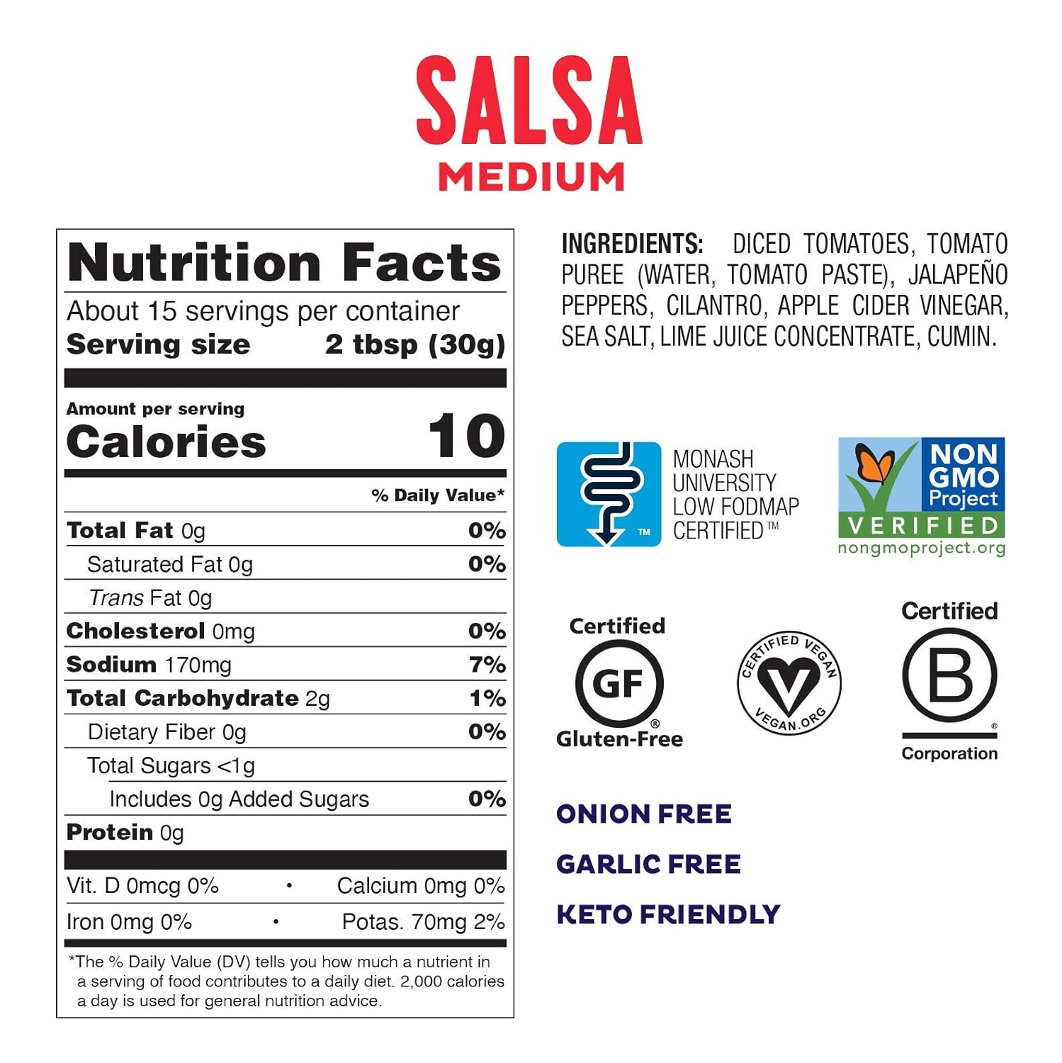Flavor Without Discomfort: Gut lovin' and spicy. Our Low FODMAP Medium Salsa, with just a little kick, is deliciously designed for people living with IBS - made without onion or garlic and packed with clean ingredients like diced tomatoes, jalapenos, cumin and apple cider vinegar