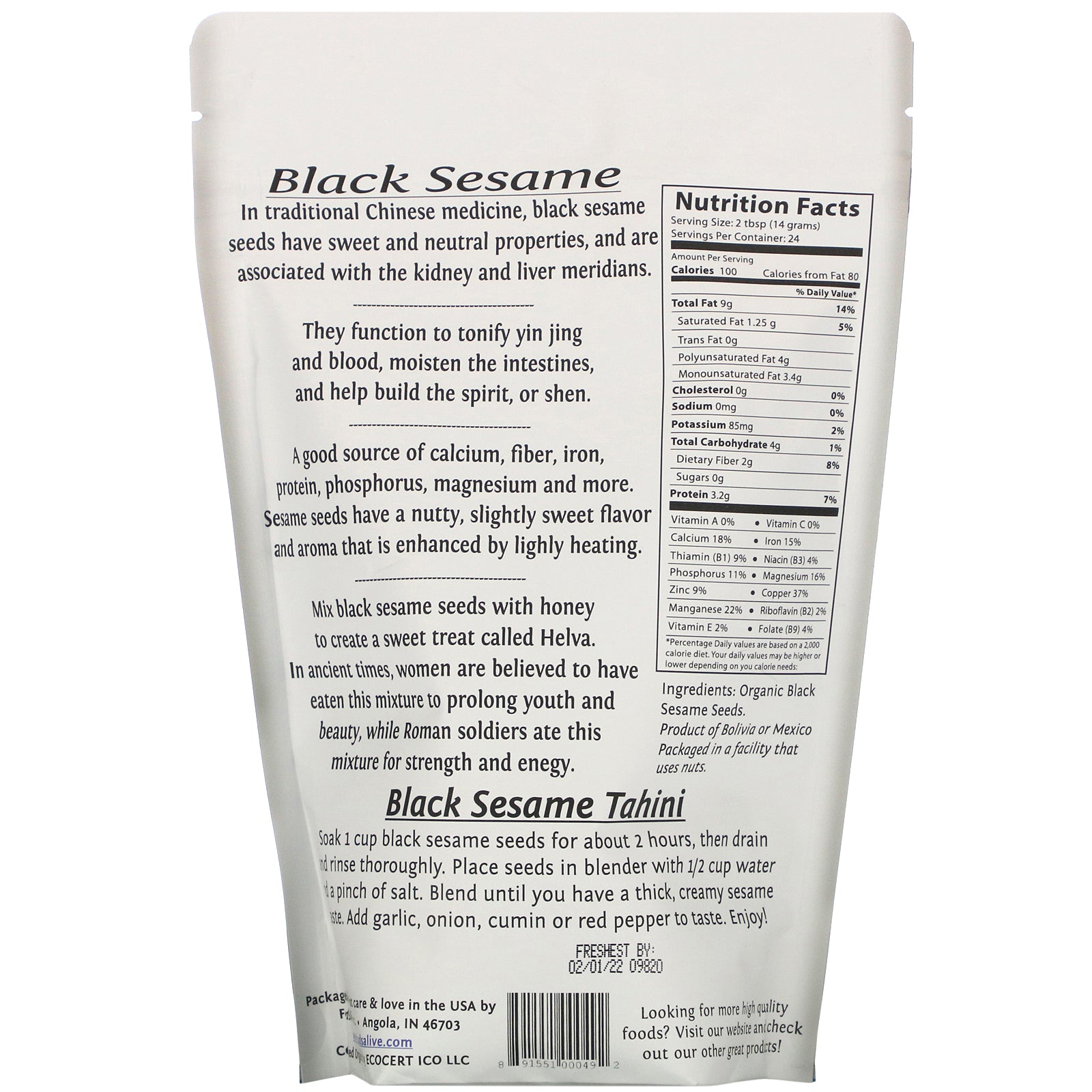 Open Sesame... go ahead, say it, you known you want to!USDA OrganicRAWVeganKosherNon-GMOIn traditional Chinese medicine, black sesame seeds have sweet and neutral properties, and are associated with the kidney and liver meridians.They function to tonify yin jing and blood, moisten the intestines, and help build the spirit, or shen.A good source of calcium, fiber, iron, protein, phosphorus, magnesium and more. Sesame seeds have a nutty, slightly sweet flavor and aroma that is enhanced by lightly heating.Black sesame seeds can be added to your favorite granolas, yogurts, energy bars, crackers, soups, sauces, dips or breads, sprinkle them on salads, pasta and more for a unique nutty flavor! Free Of Gluten, GMOs. Disclaimer These statements have not been evaluated by the FDA. These products are not intended to diagnose, treat, cure, or prevent any disease. Foods Alive Black Sesame Seed Raw 14 oz - Vegan