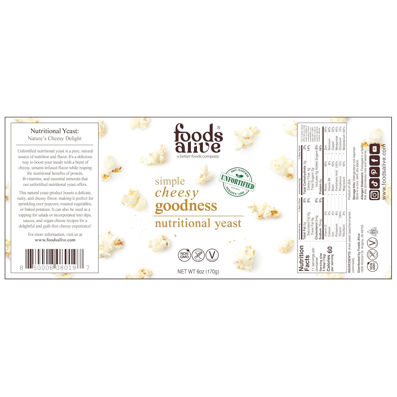 About this item OUR NUTRITIONAL YEAST IS A NON-GMO AND GLUTEN FREE, PLANT BASED PROTEIN MADE IN THE USA! GREAT KETO FOOD AND POPCORN SEASONING; SOURCE OF DIETARY FIBER, VITAMINS AND MINERALS. MAKES GREAT VEGAN PARMESAN CHEESE SUBSTITUTE, PROVIDES UMAMI KICK TO ANY SOUPS OR WHOLE FOODS! THIS LOW CARB AND FAT FREE COMPLETE PROTEIN PROVIDES THE AMINO ACIDS THE HUMAN BODY CANNOT PRODUCE. FOODS ALIVE NUTRITIONAL YEAST CONTAINS NO FOLIC ACID, NO ARTIFICIAL VITAMINS; RICH IN ANTIOXIDANTS. See more product details,OUR NUTRITIONAL YEAST IS A NON-GMO AND GLUTEN FREE, PLANT BASED PROTEIN MADE IN THE USA!,GREAT KETO FOOD AND POPCORN SEASONING; SOURCE OF DIETARY FIBER, VITAMINS AND MINERALS,MAKES GREAT VEGAN PARMESAN CHEESE SUBSTITUTE, PROVIDES UMAMI KICK TO ANY SOUPS OR WHOLE FOODS!,THIS LOW CARB AND FAT FREE COMPLETE PROTEIN PROVIDES THE AMINO ACIDS THE HUMAN BODY CANNOT PRODUCE,FOODS ALIVE NUTRITIONAL YEAST CONTAINS NO FOLIC ACID, NO ARTIFICIAL VITAMINS; RICH IN ANTIOXIDANTS