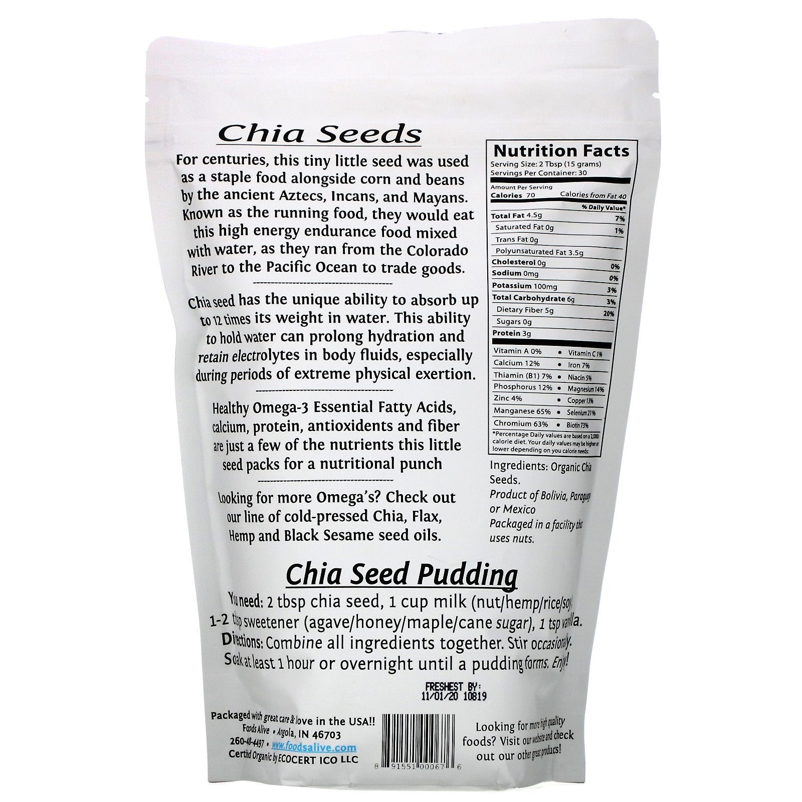 Ancient superfood of the Aztecs, Incans and Mayans!16 Ounce Warrior Size!USDA OrganicRawVeganNon-GMOKosherFor centuries, this tiny little seed was used as a staple food alongside corn and beans by the ancient Aztecs, Incans, and Mayans. Known as the running food, they would eat this high energy endurance food mixed with water, as they ran from the Colorado River to the Pacific Ocean to trade goods.Chia seed has the unique ability to absorb up to 12 times its weight in water. This ability to hold water can prolong hydration and retain electrolytes in body fluids, especially during periods of extreme physical exertion.These chia seeds have a mild nutty flavor and can be easily sprinkled onto salads, toast, oatmeal, granola, baked goods, or added to smoothies, juice, yogurt or homemade jellies.Healthy Omega-3 Essential Fatty Acids, calcium, protein, antioxidants and fiber are just a few of the nutrients this little seed packs for a nutritional punch! Free Of Gluten, GMOs. Disclaimer These statements have not been evaluated by the FDA. These products are not intended to diagnose, treat, cure, or prevent any disease. Foods Alive Organic Chia Seeds, 16 Oz