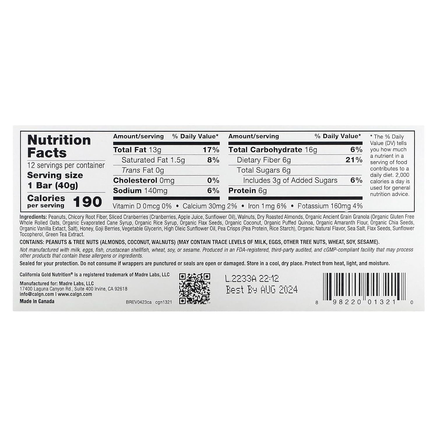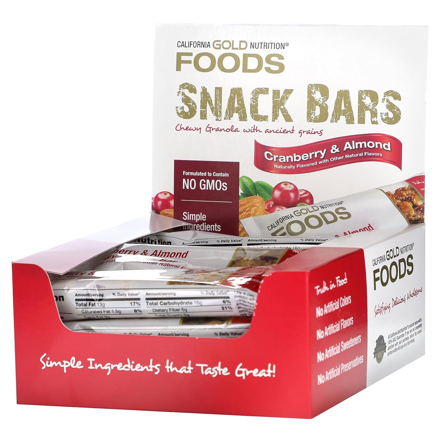 DESCRIPTION : California Gold Nutrition Foods Cranberry & Almond Chewy Granola Bars 12 Individually Wrapped Bars, 1.4 oz (40g) Each Simple Ingredients - 5g Fiber - 6g Plant-Based Protein Satisfying, Delicious & Wholesome Truth in Food: No Artificial Colors, Flavors, Sweeteners or Preservative Formulated to Contain: No GMOs, No Soy, No Trans Fats Produced in a 3rd Party Audited cGMP Registered (Certified) Facility 100% Gold GuaranteeSimple Ingredients that Taste Great! California Gold Nutrition Foods Cranberry & Almond Chewy Granola Bars are the gold standard for snacking and made with ancient grains, nuts, cranberries, goji berries and a touch of honey. Nutritious & satisfying, these individually wrapped snack bars are perfect for on-the-go deliciousness, anytime, anywhere. Truth in Food: No Artificial Colors No Artificial Flavors No Artificial Sweeteners No Artificial Preservatives No Trans Fats