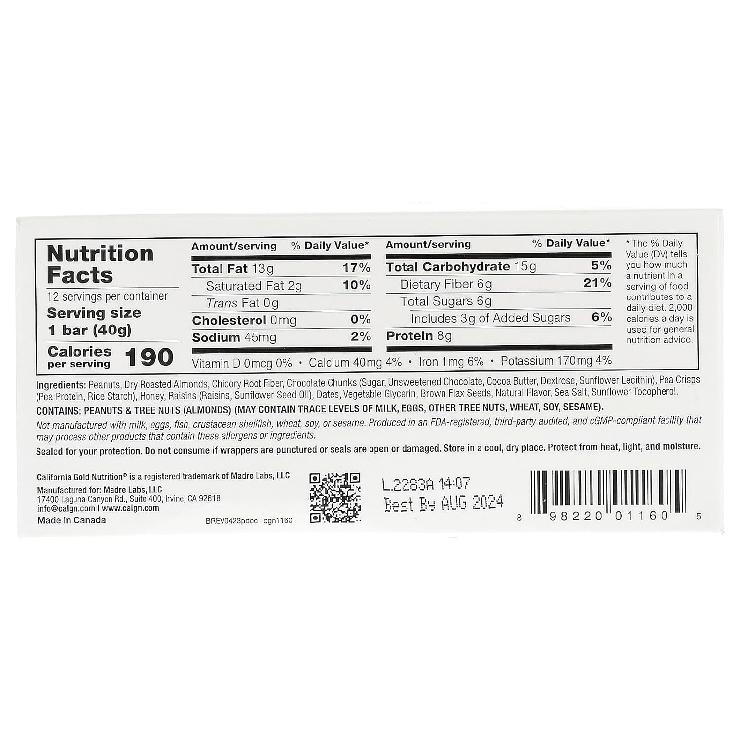 DESCRIPTION : FOODS, Peanut & Dark Chocolate Chunk Bars , 12 Bars, 1.4 oz (40 g) Each, California Gold Nutrition