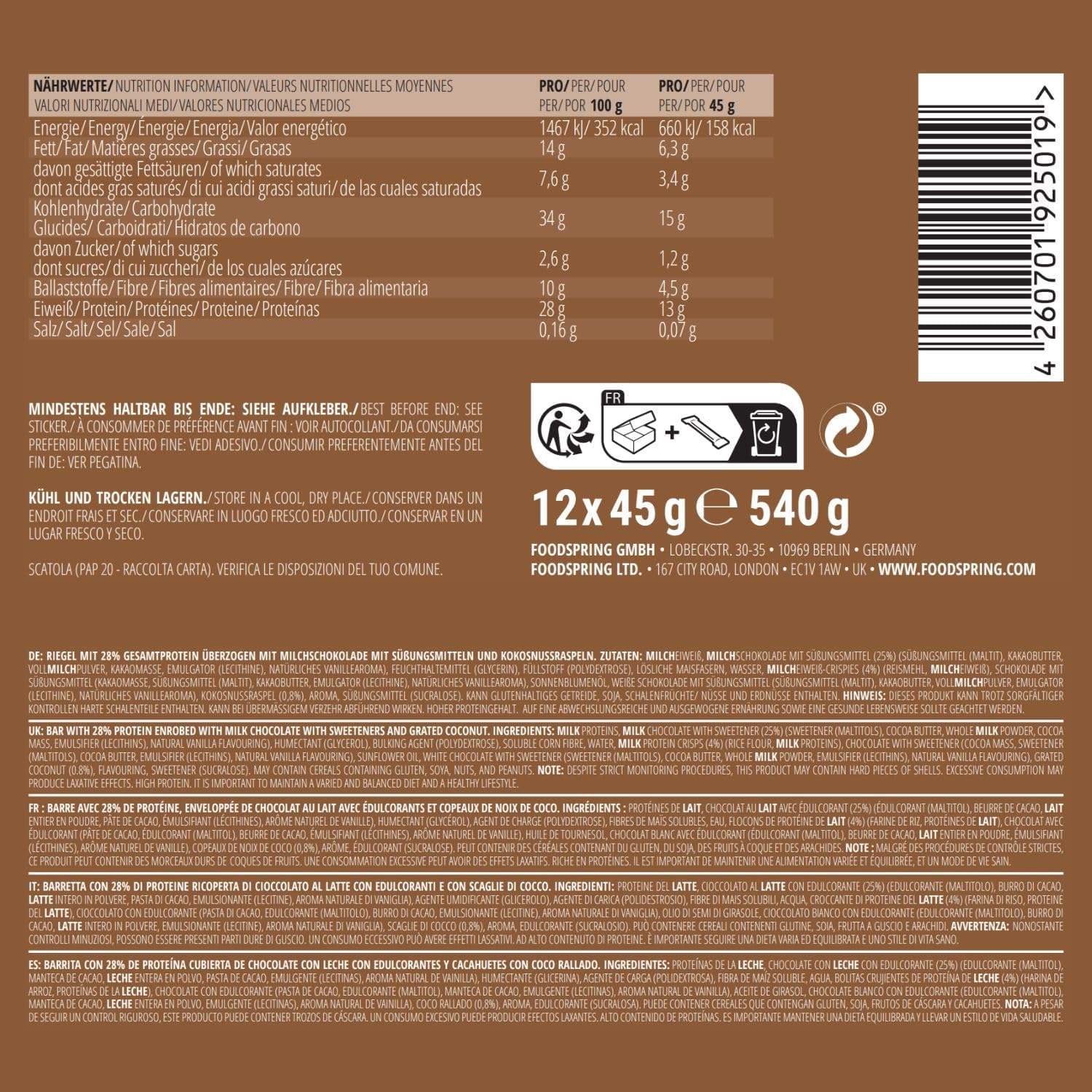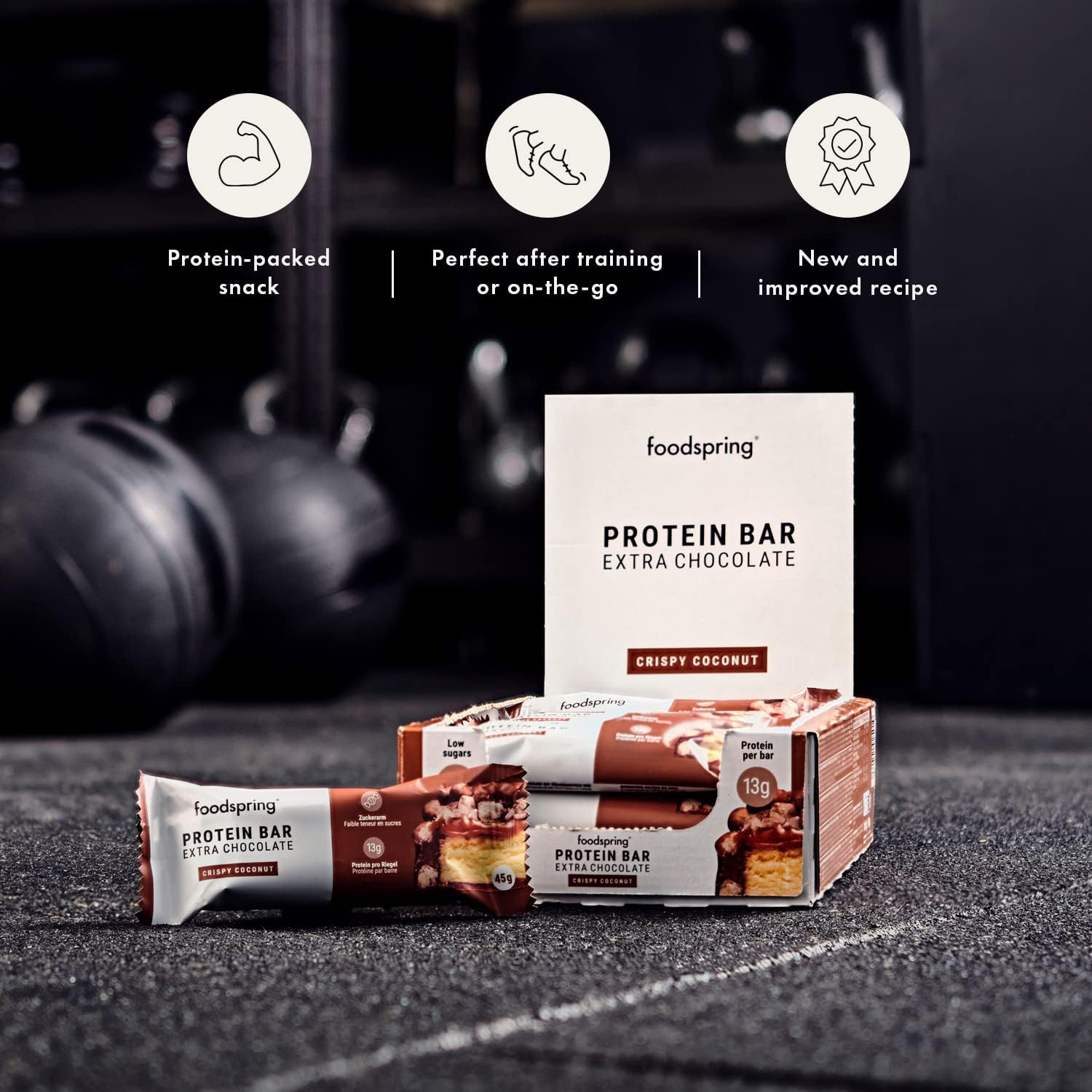 Foodspring New Extra Chocolate Protein Bars - 13G Protein Per Bar, No Added Sugar, Nutritious Post-Workout Or On-The-Go Snack - Crispy Coconut - 45G, Pack Of 12