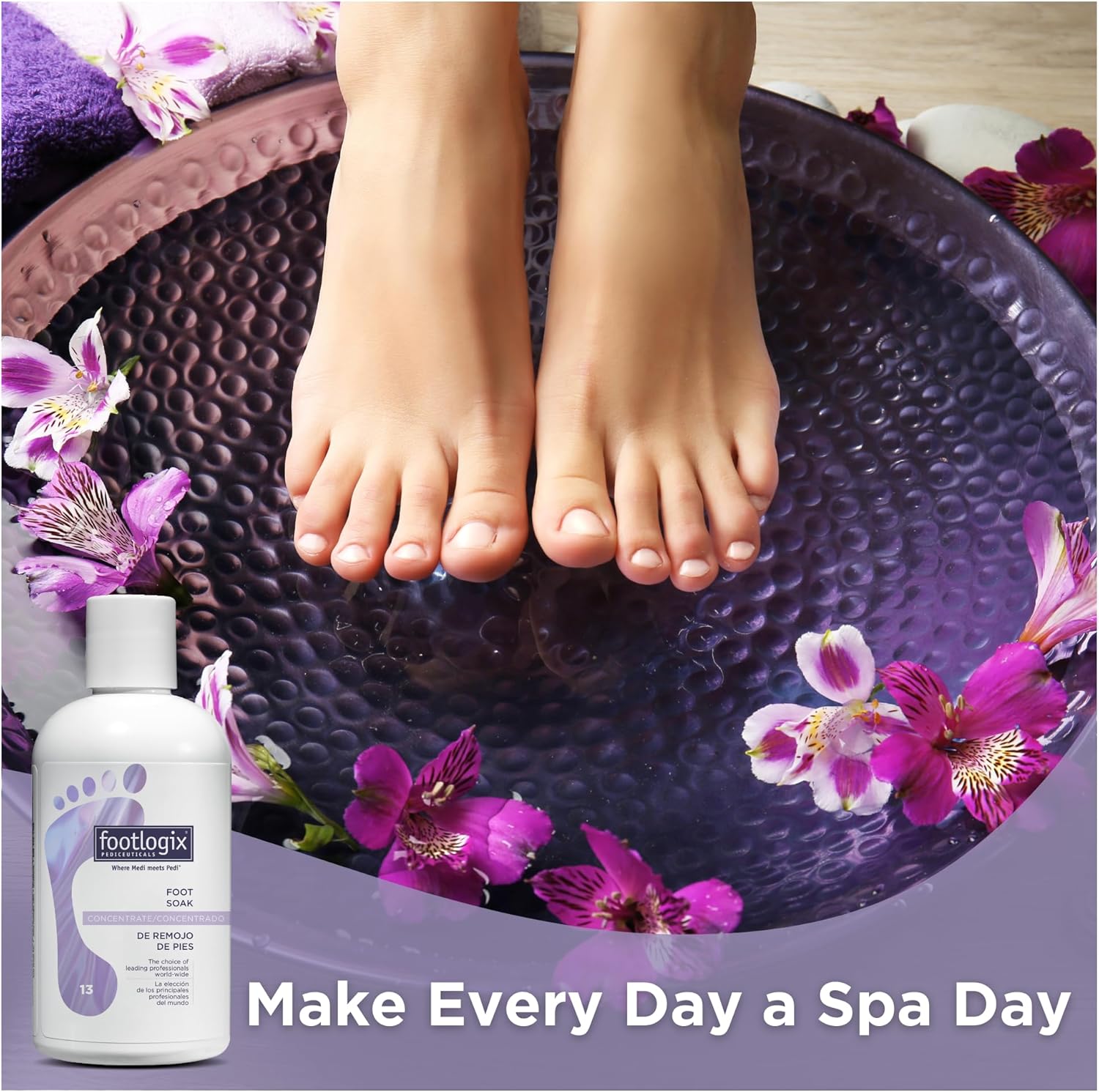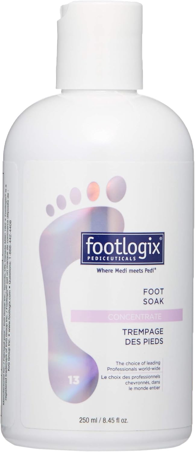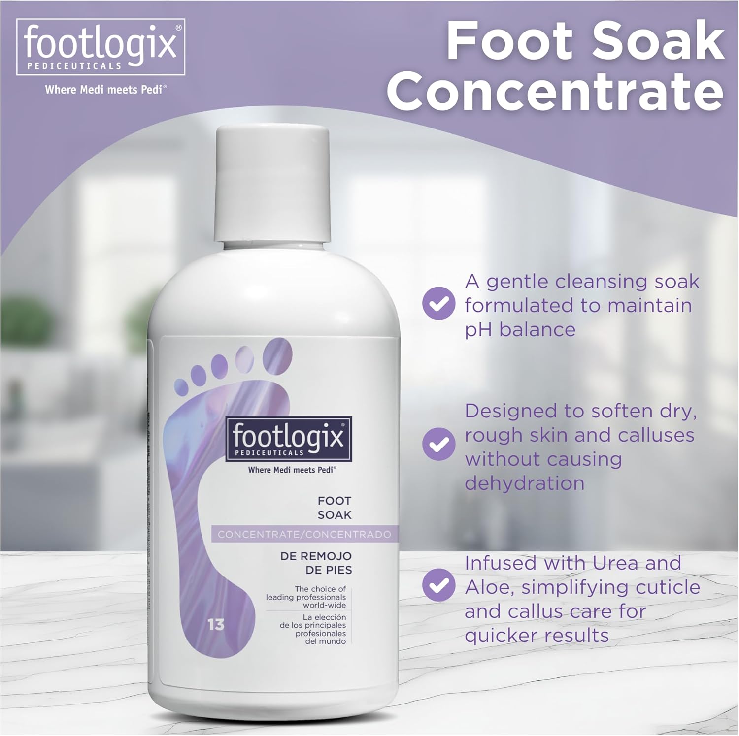 Product Description xperience a refreshing cleanse with our Footlogix Foot Soak Concentrate, the ideal solution for effective foot care. This pH-balanced product is a gentle yet impactful way to soften dry, rough skin and transform your feet. Brand Story Footlogix is the world's first and only Pediceutical foot care line. Our innovative products provide effective and transformational results for a variety of skin conditions of the the feet,Cleans the skin softly and gently,Does not dehydrate the skin while soaking,Diabetic friendly,Mild cleansing foot soak,Help soften calluses