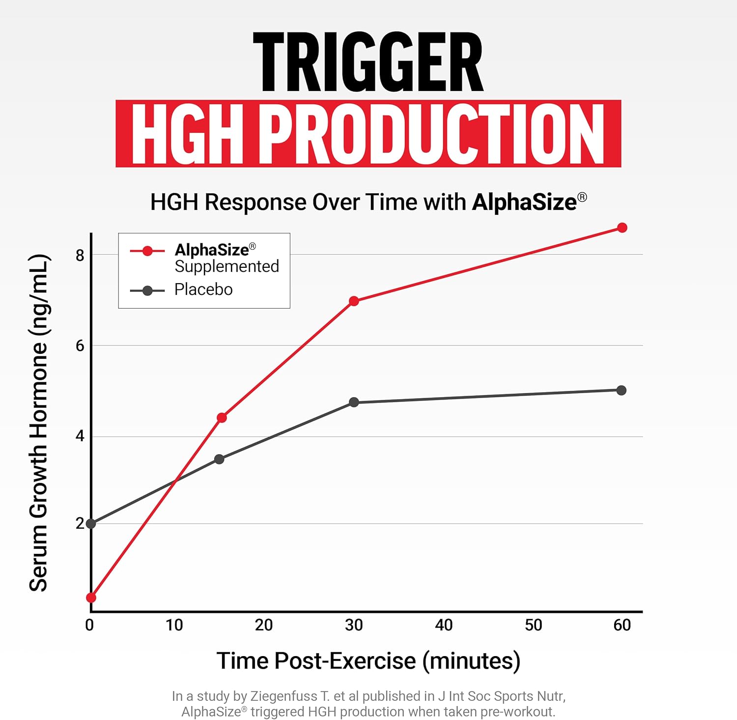 TRIGGER HGH: At the precise dosage included in Alpha King Immortal, patented AlphaSize has been scientifically shown to help trigger an increase in HGH when taken before strength training, for optimal muscle gain