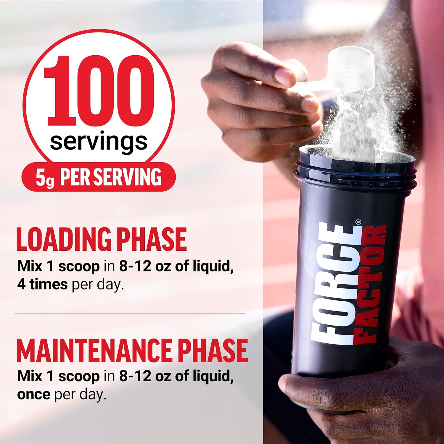 About this item BUILD LEAN MUSCLE & STRENGTH: Each scoop of Force Factor Creatine Monohydrate Powder helps fuel workouts by increasing muscular energy, so you can train harder, lift heavier, and build strength more effectively. RECOVER FASTER & REDUCE FATIGUE: Formulated to help replenish muscle energy post-workout, Force Factor Creatine supports muscle repair and recovery while helping to reduce soreness and fatigue between training sessions. SUPPORT COGNITIVE HEALTH & MEMORY: Creatine monohydrate helps support brain energy metabolism, which may promote cognitive performance, clarity, and memory*—especially during periods of physical or cognitive fatigue. SCIENTIFICALLY STUDIED 5G DOSE: Each serving of Force Factor Creatine Monohydrate Powder delivers a validated 5g dose of creatine monohydrate—scientifically proven to support strength gains, endurance, and improved athletic performance. PURE, UNFLAVORED & QUALITY TESTED: Force Factor Creatine Powder is micronized for easy mixing and contains no artificial flavors, colors, or sugar. Made in the USA in GMP-compliant facilities and third-party tested for purity and potency. See more product details,BUILD LEAN MUSCLE & STRENGTH: Each scoop of Force Factor Creatine Monohydrate Powder helps fuel workouts by increasing muscular energy, so you can train harder, lift heavier, and build strength more effectively,RECOVER FASTER & REDUCE FATIGUE: Formulated to help replenish muscle energy post-workout, Force Factor Creatine supports muscle repair and recovery while helping to reduce soreness and fatigue between training sessions,SUPPORT COGNITIVE HEALTH & MEMORY: Creatine monohydrate helps support brain energy metabolism, which may promote cognitive performance, clarity, and memory*—especially during periods of physical or cognitive fatigue,SCIENTIFICALLY STUDIED 5G DOSE: Each serving of Force Factor Creatine Monohydrate Powder delivers a validated 5g dose of creatine monohydrate—scientifically proven to support strength gains, endurance, and improved athletic performance,PURE, UNFLAVORED & QUALITY TESTED: Force Factor Creatine Powder is micronized for easy mixing and contains no artificial flavors, colors, or sugar. Made in the USA in GMP-compliant facilities and third-party tested for purity and potency