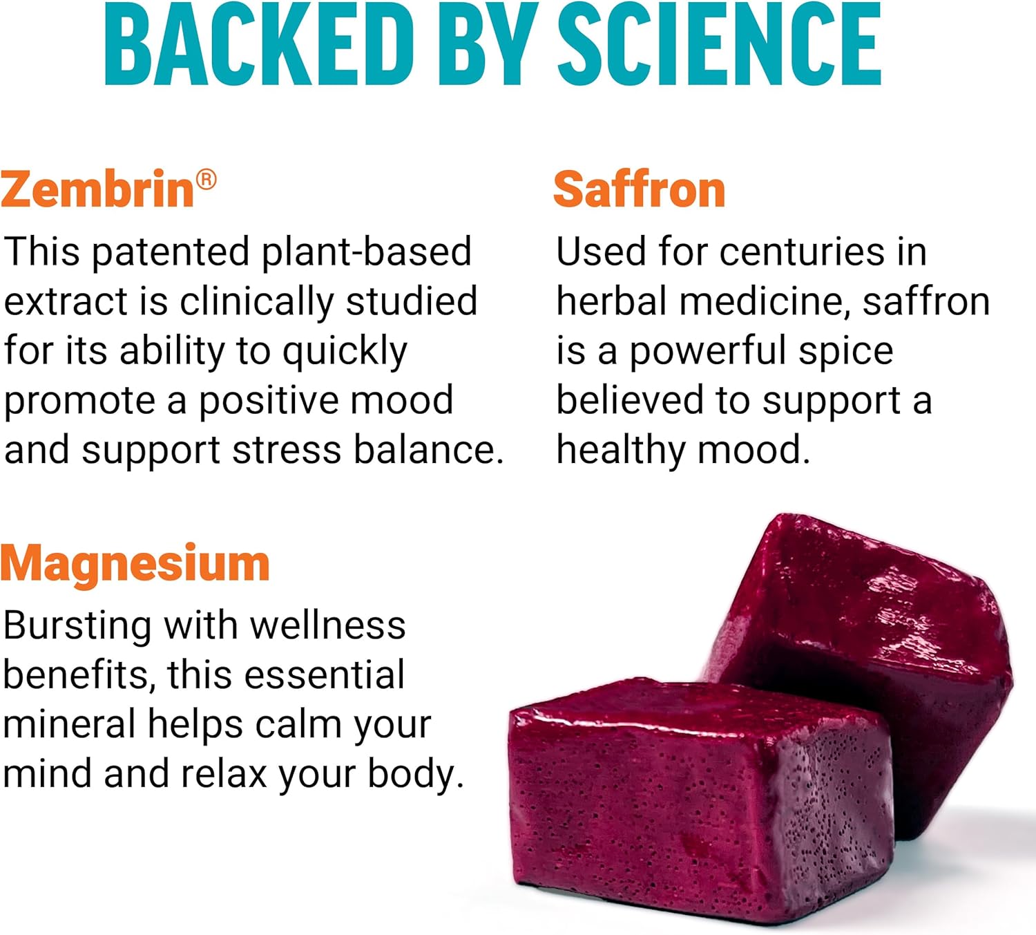 Ingredients Backed By Science: Every Chew Is Packed With Zembrin, Saffron, Magnesium, And Vitamins B And D, Ingredients Scientifically Studied For Their Ability To Promote Calm, Relaxation, And Mood Balance