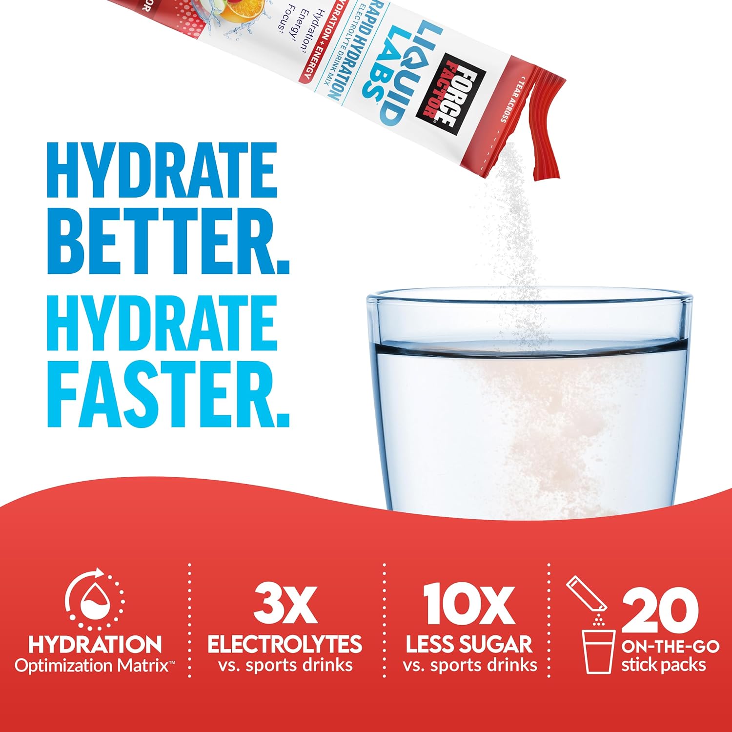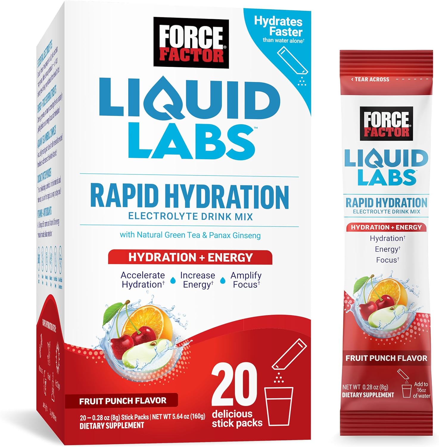 HYDRATE FASTER & BETTER: Liquid Labs’ exclusive Hydration Optimization Matrix blends five key electrolytes, coconut water, and Aquamin sea mineral complex with natural cane sugar to speed up absorption to hydrate you better and faster than water alone10BOOST ENERGY & FOCUS: Every delicious sip contains Panax ginseng, green tea, and taurine – a naturally uplifting blend of energizing ingredients to help you boost energy, focus, and motivation for work, workouts, and everything in between10CONTAINS 10X LESS SUGAR: Too many sports drinks and electrolytes powders are overloaded with sugar. Liquid Labs is a great-tasting, better-for-you hydration powder that is made with 10x less sugar than the leading sports drink10MADE WITH 3X MORE ELECTROLYTES: Don’t be fooled by hydration packets that are mostly sugar and salt. Liquid Labs hydration packs contain 3x more electrolytes than leading sports drinks, providing you with fast, refreshing, high-quality hydration10REFRESHING & GREAT-TASTING: Water is vital for good health, but it can be a little boring. Liquid Labs electrolyte drink mix is bursting with refreshing fruit flavor you’ll love, and contains no artificial sweeteners or artificial dyes10Stay refreshed and energized with Liquid Labs Energy drink mix from Force Factor. Liquid Labs' advanced Hydration Optimization Matrix™ is an innovative electrolytes powder formulated to deliver rapid, superior hydration. This unique blend of five key electrolytes, coconut water, and Aquamin sea mineral complex helps you stay hydrated and perform at your peak, no matter where life takes you. Our hydration packets and daily energy drink are designed for on-the-go convenience, providing 3x more electrolytes and 10x less sugar than leading sports drinks. The electrolytes powder packets are easy to mix with water, creating an electrolyte drink that is both delicious and efficient in replenishing your body's essential nutrients. Whether you're an athlete, a fitness enthusiast, or just someone who needs an energy boost, Liquid Labs rapid hydration supplement provides a healthier, more effective alternative to traditional sports drinks. Upgrade your hydration game with Liquid Labs Hydration Supplement by Force Factor, and experience the difference in performance, endurance, and overall wellbeing. Order now and join the growing community of active adults, athletes, and busy professionals who trust Liquid Labs for their hydration needs
