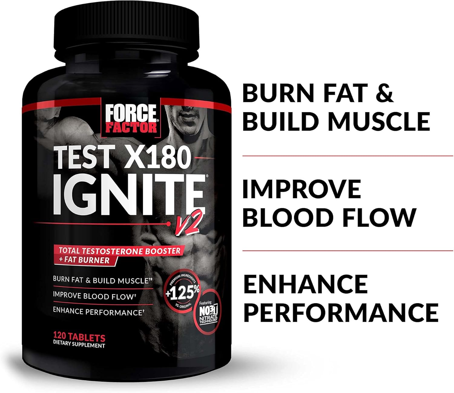 Force Factor Test X180 Ignite V2 Testosterone Booster & Supplement With Nitrates To Burn Fat, Build Muscle, Boost Energy And Enhance Vitality, Black, 120 Count