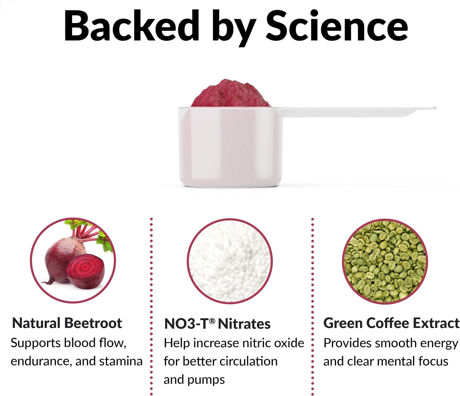 If you’re looking for a healthier way to boost your workout performance without relying on a high-stimulant energy drink or energy shots, reach for Total Beets Pre-Workout. Patented NO3-T® nitrates combined with time-tested l-citrulline help optimize circulation and blood flow for greater strength, endurance, and muscle pumps. Green coffee extract works to deliver the clear energy and mental focus you need to power through your toughest workouts, while Himalayan pink salt, coconut water powder, and key electrolytes help keep you hydrated and fueled to train longer and harder. It’s a heart-healthier preworkout for men or preworkout for women